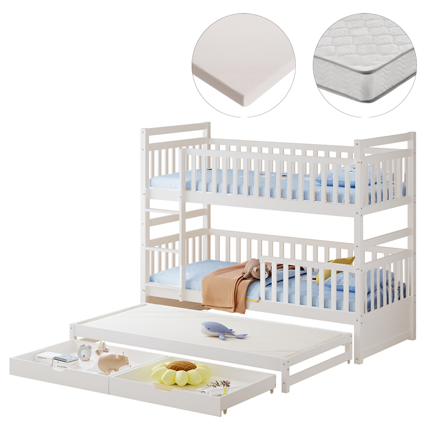 -Σας παρουσιάζουμε το καινούργιο παιδικό κρεβάτι-κουκέτα TRIPLON σε διάσταση για μονά στρώματα 90×190 & 200 εκ, που αποτελεί μια άριστης ποιότητας, μοντέρνα και ασφαλή επιλογή για το παιδικό δωμάτιο. Είναι ξύλινο σε ΛΕΥΚΟ χρώμα βαμμένο με αβλαβές μη τοξικό βερνίκι με βάση το νερό, ιδανικό για παιδιά. Τα στρώματα τοποθετούνται σε τάβλες κατασκευασμένες από ξυλεία κόντρα πλακέ. Η πρόσβαση στο επάνω κρεβάτι γίνεται με πρακτική κάθετη σκάλα, ενώ και τα δύο κρεβάτια διαθέτουν περιμετρικά κάγκελα. Ωστόσο, αυτή η κουκέτα ξεχωρίζει για το γεγονός ότι έχει και ένα ακόμα κρεβάτι που είναι συρόμενο και τοποθετείται στο κάτω μέρος της κουκέτας, όπως και 2 συρτάρια στα οποία μπορείτε να τοποθετήσετε οτιδήποτε χρειαστεί. Μια ιδανική πρόταση για σπίτια με περιορισμένο χώρο.