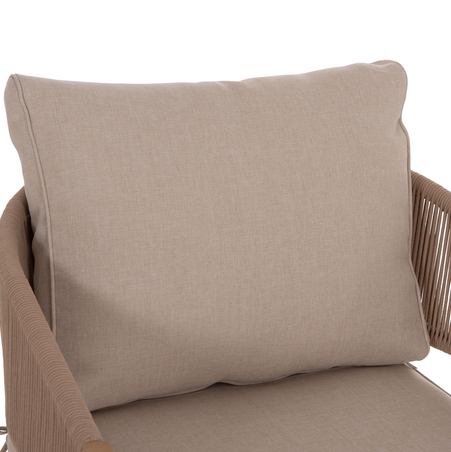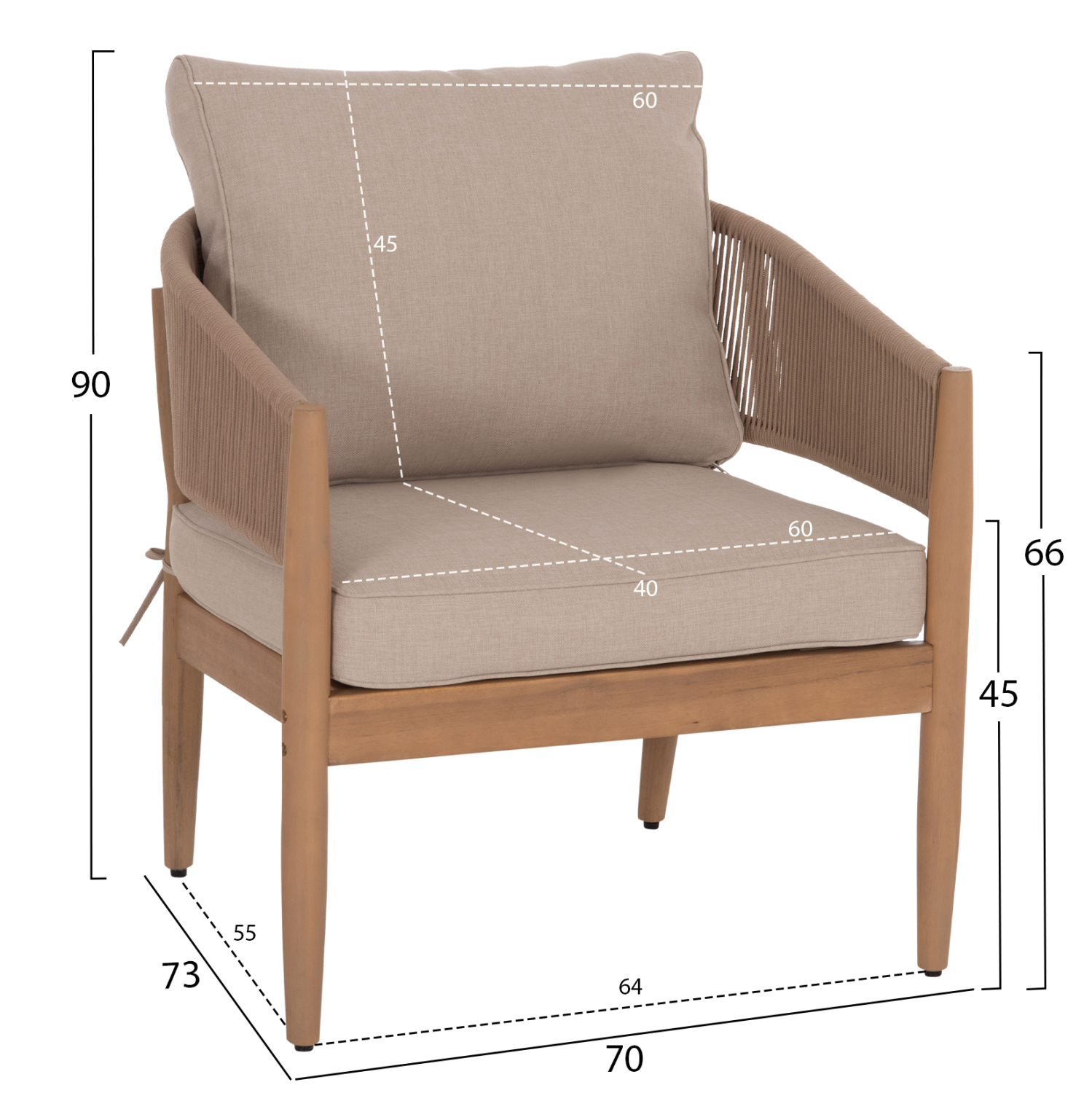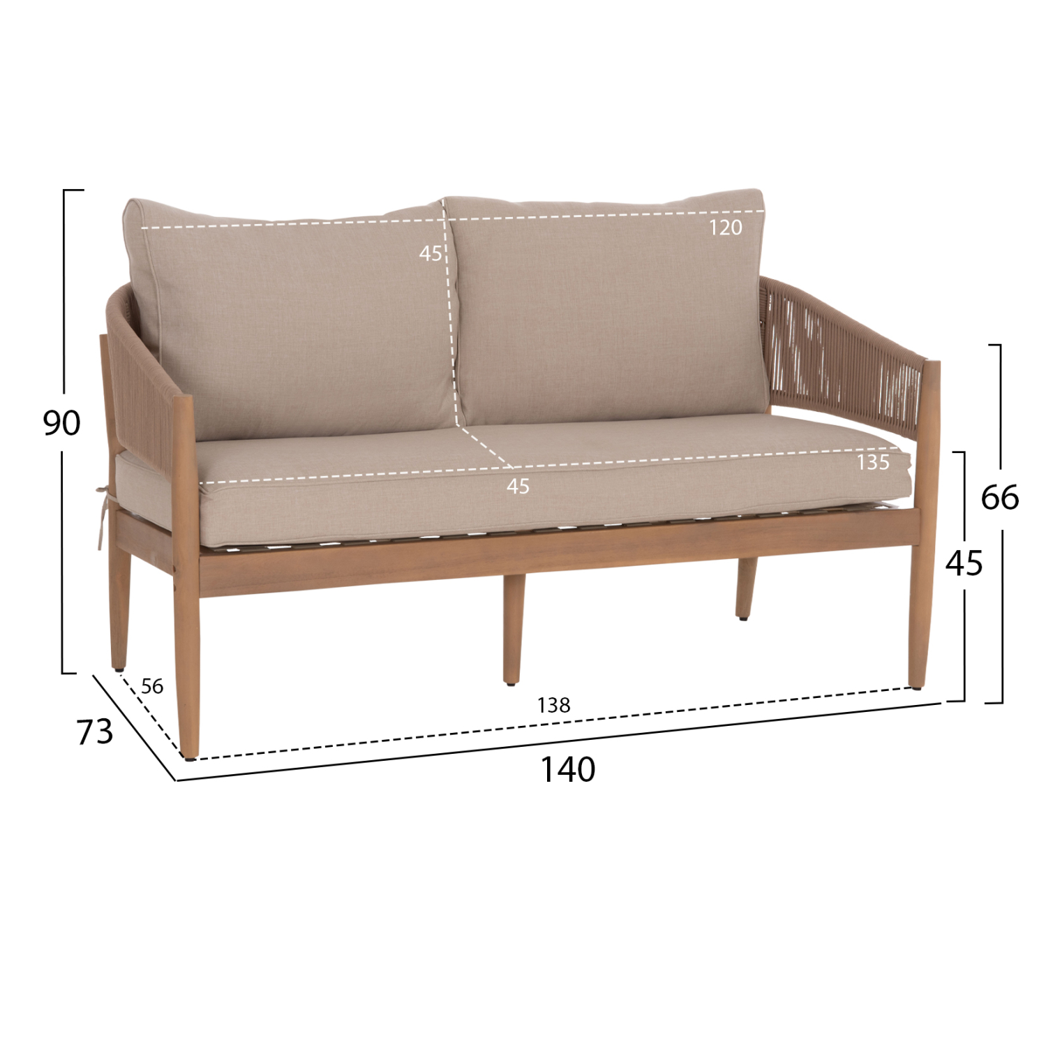 Ο μεταλλικός σκελετός εξασφαλίζει αντοχή και σταθερότητα, ενώ τα πόδια από ξύλο ακακίας προσθέτουν ζεστασιά και φυσικό χαρακτήρα. Η επένδυση πλάτης με σχοινί δημιουργεί ιδιαίτερη υφή και αίσθηση χαλάρωσης, ενώ τα μαξιλάρια από πολυεστερικό ύφασμα σε μπεζ απόχρωση προσφέρουν άνεση και κομψότητα. Το τραπεζάκι με επιφάνεια ακακίας, είναι ιδανικό για καθημερινή χρήση σε εξωτερικούς χώρους.