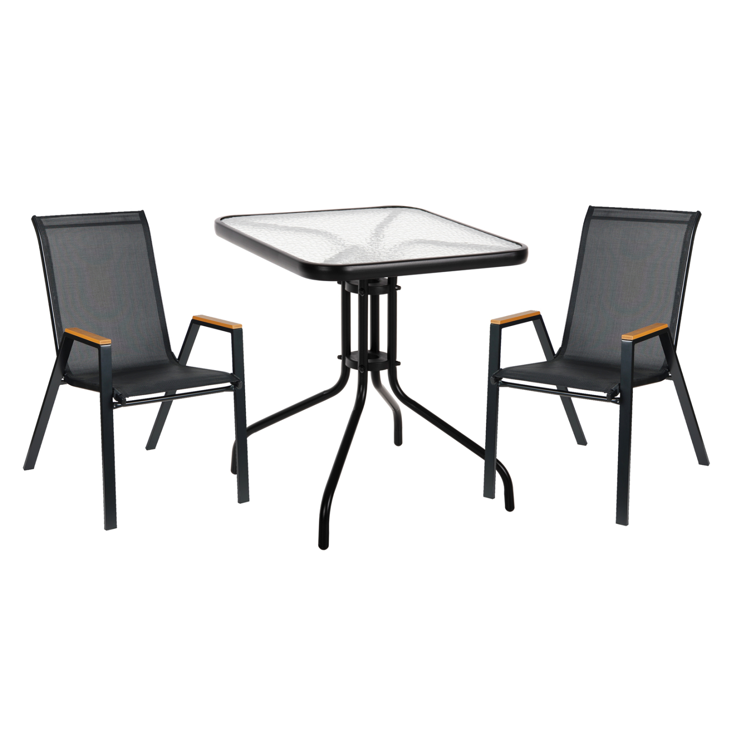 Αυτό το μικρό Σετ τραπεζαρίας εξωτερικού χώρου διαθέτει τετράγωνο τραπέζι με ΜΑΥΡΟ μεταλλικό σκελετό και γυάλινη (safety glass) θολή επιφάνεια, και 2 μεταλλικές πολυθρόνες με κάθισμα& πλάτη από textilene ύφασμα σε ΜΑΥΡΟ, με ξύλινη επένδυση στα μπράτσα.