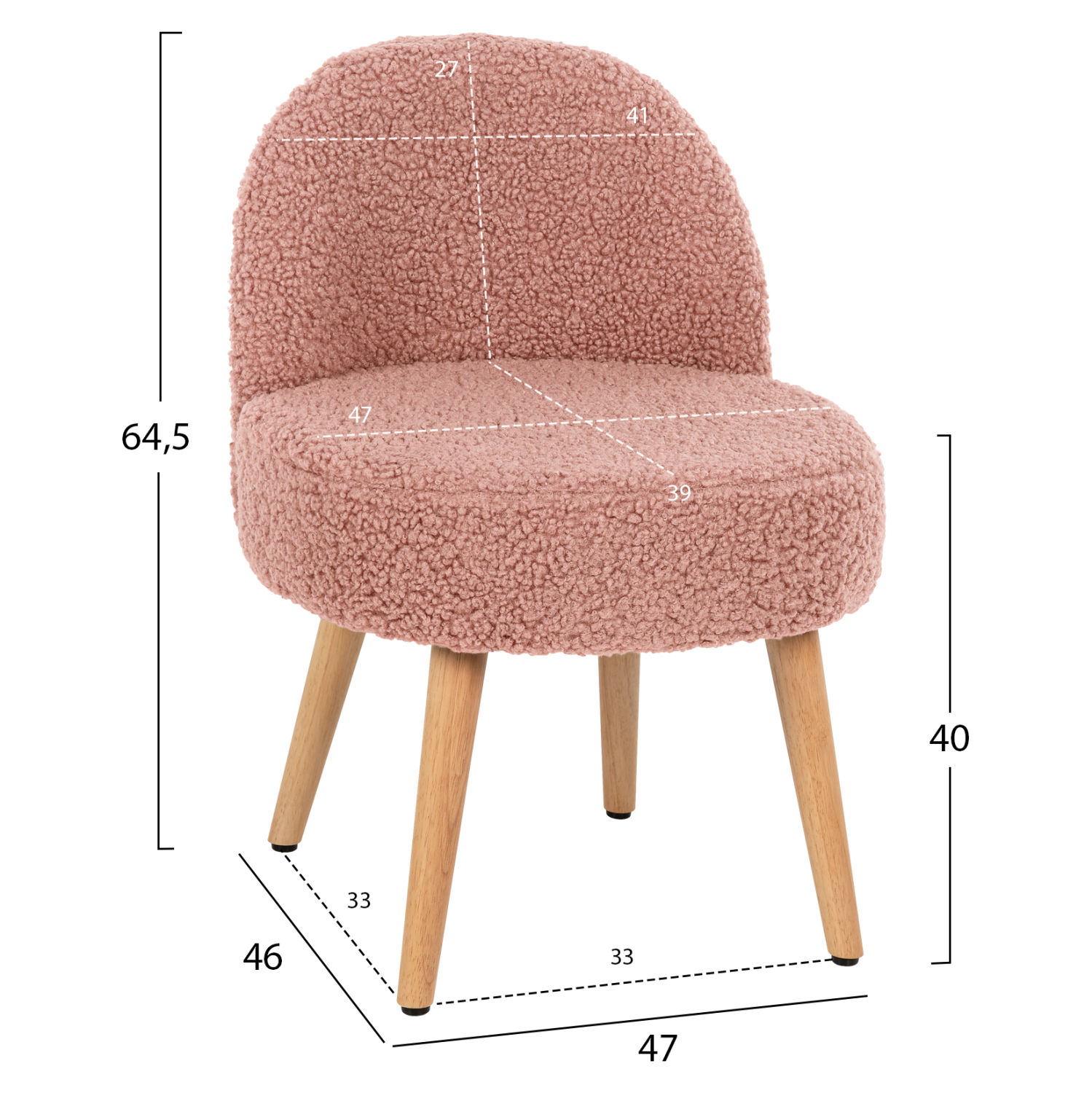 Σκαμπό με πολύ χαμηλή πλάτη YASMINE με επένδυση από ζεστό μπουκλέ ύφασμα σε ΣΑΠΙΟ ΜΗΛΟ απόχρωση, με ξύλινα πόδια σε φυσική απόχρωση.