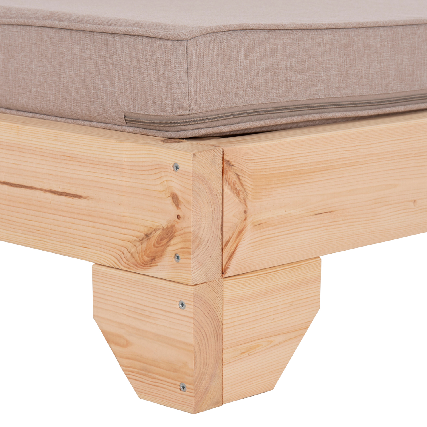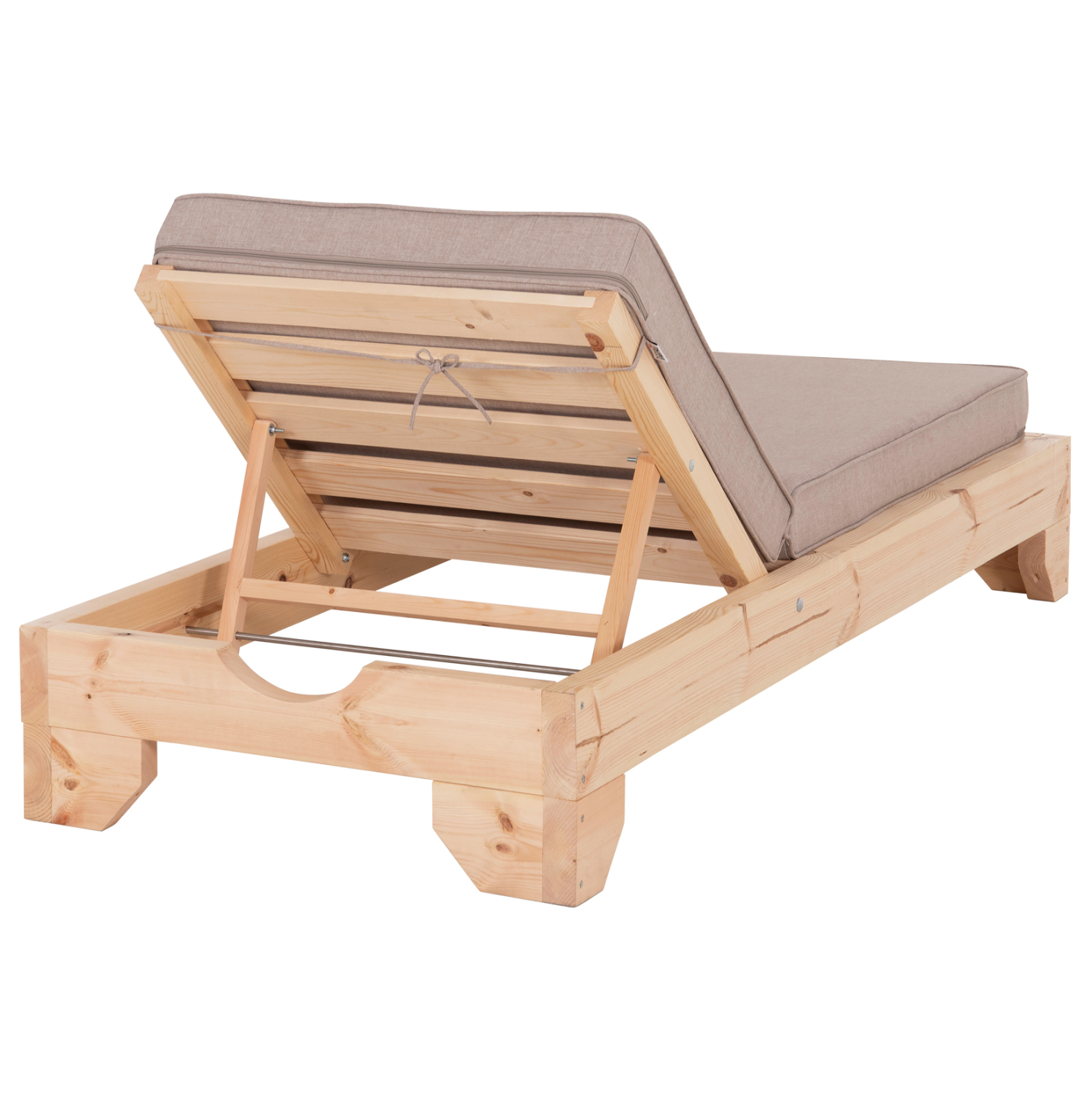 -Ολόκληρη η ξαπλώστρα έχει κατασκευαστεί από ξύλο πεύκου με εμποτισμό και επιπλέον στρώση με βερνίκι νερού. Το πεύκο είναι ένα μαλακό, λευκό ή ανοιχτό κίτρινο ξύλο το οποίο είναι ελαφρύ σε βάρος με ευθύγραμμα νερά ξύλου. Αντέχει στη συρρίκνωση, διόγκωση και κάμψη. Ο εμποτισμός υπό την ευρεία έννοια είναι ο χρωματισμός του ξύλου (συνήθως βερνίκια) με την μέθοδο της εμβάπτισης.