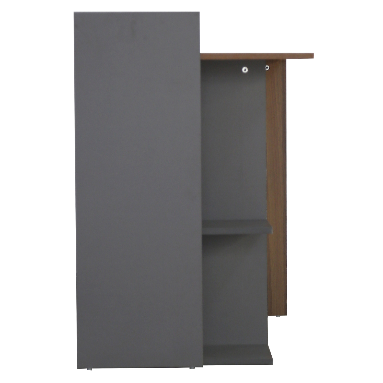 Μοντέρνο γραφείο με ενσωματωμένη βιβλιοθήκη, κατασκευασμένο από μελαμίνη υψηλών προδιαγραφών, σε διακριτική διχρωμία από καρυδί και γκρι απόχρωση.