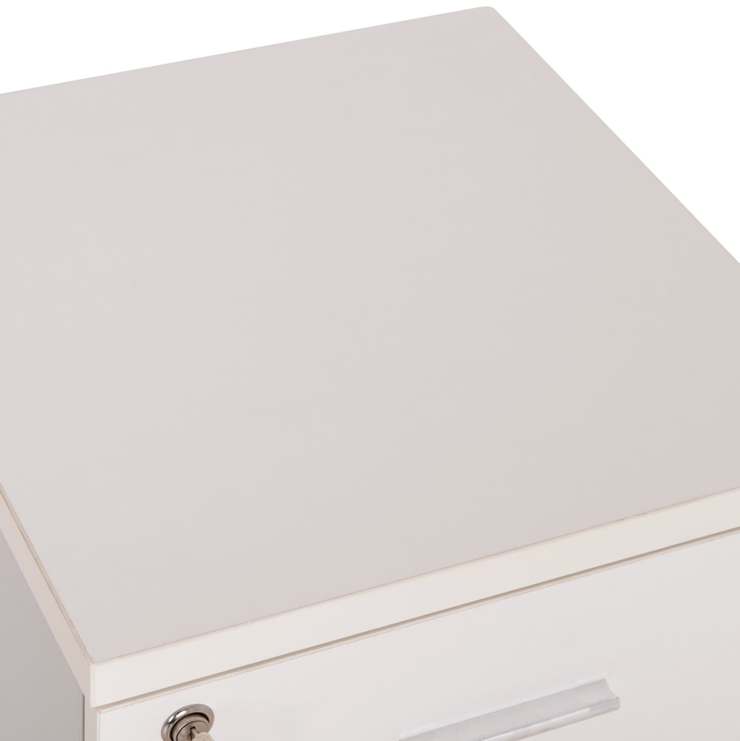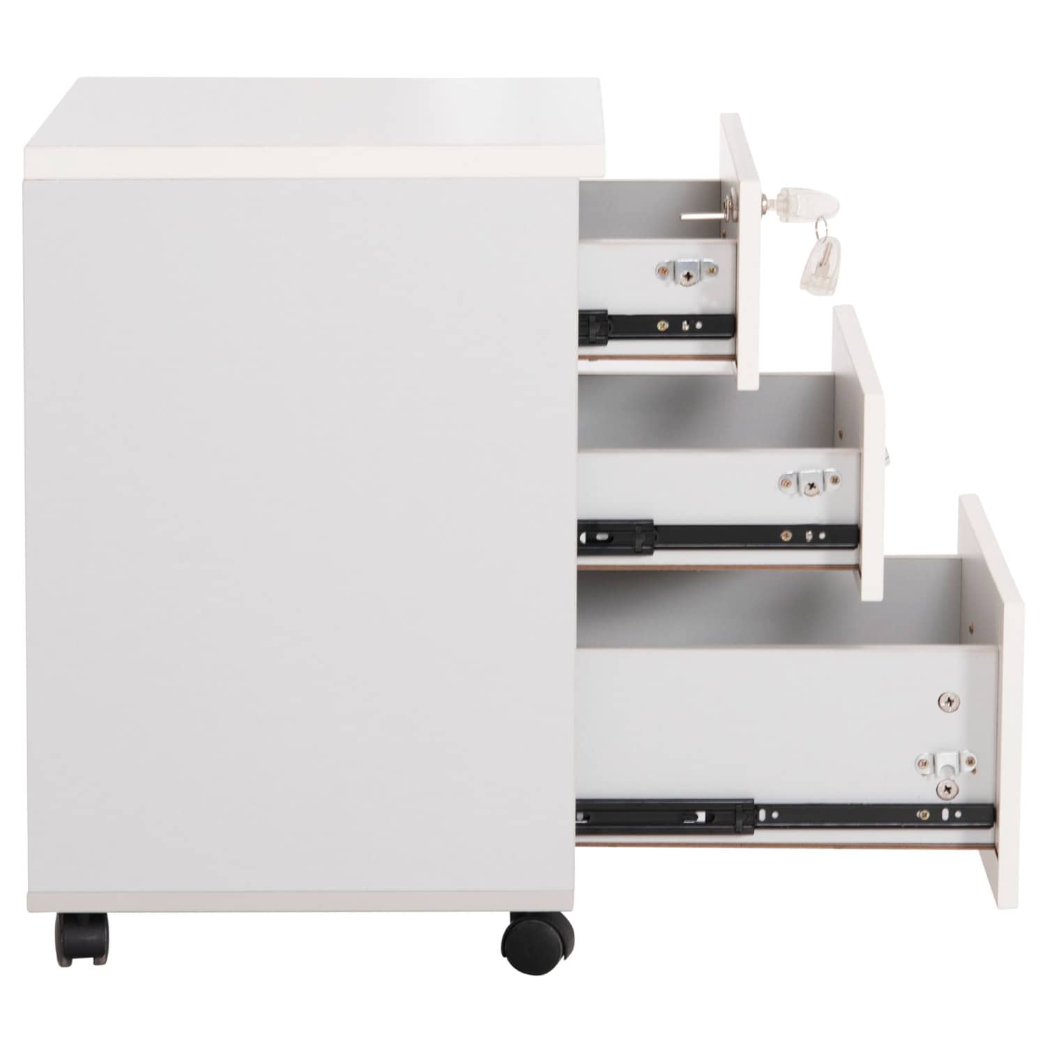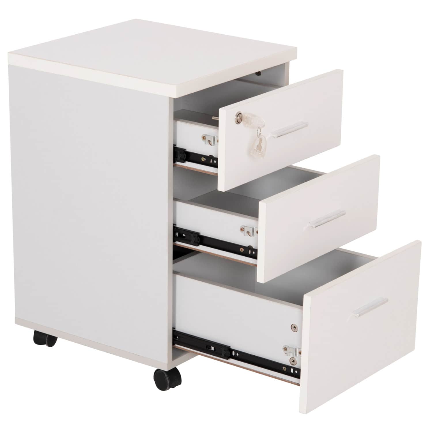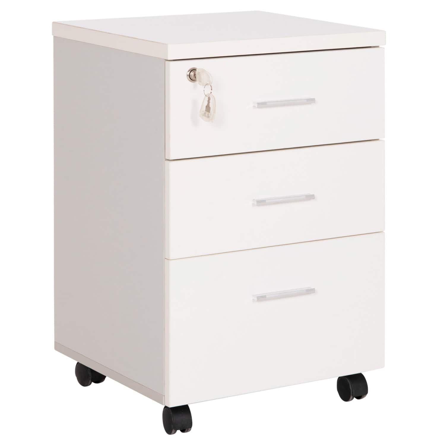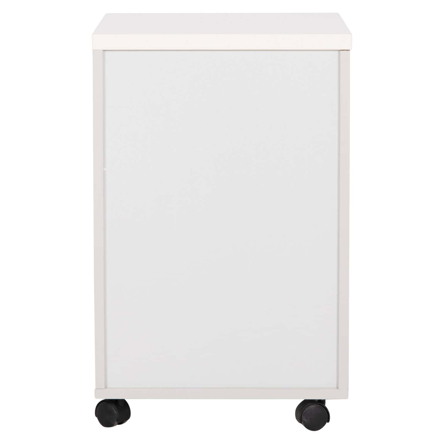 Η κατασκευή από λευκή μελαμίνη προσφέρει αντοχή και διαχρονική αισθητική, ενώ τα μαύρα ροδάκια από πολυαιθυλένιο επιτρέπουν εύκολη και ομαλή μετακίνηση.