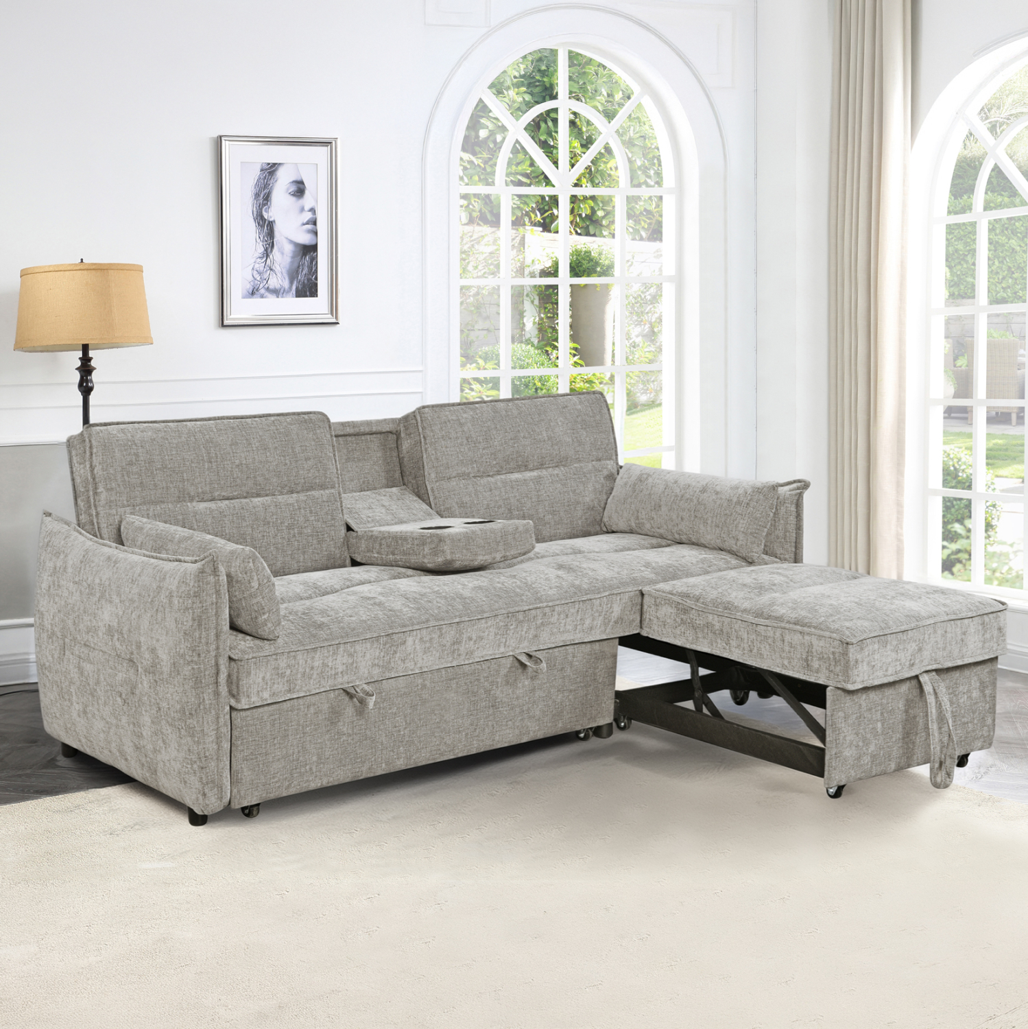 • Η πλάτη «πέφτει» με την ανάπτυξη του συρόμενου, σχηματίζοντας άνετο και μεγάλο κρεβάτι.
