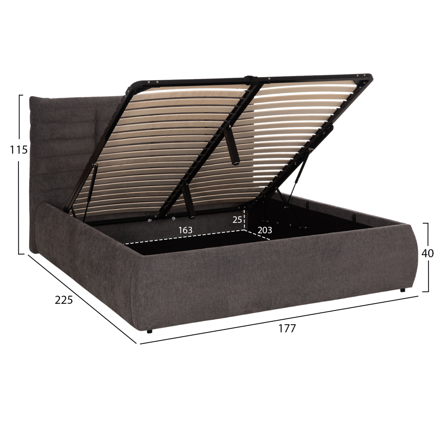 Το στρώμα στηρίζεται σε 20 σειρές εργονομικές τάβλες στήριξης, οι οποίες τοποθετούνται σε ένα μεταλλικό πλαίσιο που ανασηκώνεται με μηχανισμό ασφαλείας, προσφέροντας έναν μεγάλο αποθηκευτικό χώρο επενδυμένο επίσης με ύφασμα. Μια μοντέρνα πρόταση που θα ανανεώσει το υπνοδωμάτιό σας.