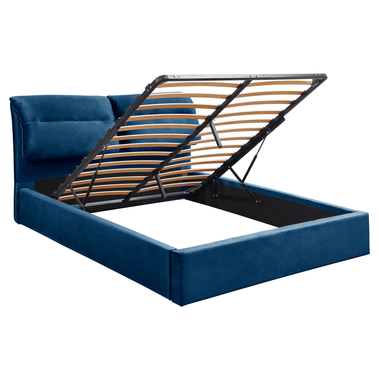 •Το κρεβάτι KENDRA σε διάσταση για στρώμα 160×200 εκ, είναι επαρκέστατα άνετο για να χωρέσουν δύο άτομα. Έχει κεφαλάρι με δύο μαξιλάρια δεμένα πάνω του (αποσπώμενα με φερμουάρ), για να προσφέρει άνεση όταν κάθεστε για να διαβάσετε το βιβλίο σας, ενώ ολόκληρη η επένδυσή του έχει γίνει με εξαιρετικής ποιότητας βελούδινο ύφασμα σε εντυπωσιακό ΜΠΛΕ χρώμα. Το στρώμα «κάθεται» πάνω σε δύο σειρές από ανατομικές τάβλες, ακολουθώντας τον παραδοσιακό τρόπο κατασκευής κρεβατιού. Επιπλέον, το τελάρο με τις τάβλες στήριξης του στρώματος ανασηκώνεται με μεταλλικό μηχανισμό ασφαλείας με 2 αμορτισέρ προσφέροντας έναν μεγάλο αποθηκευτικό χώρο, ο οποίος φυσικά καταλαμβάνει όλο τον χώρο μέχρι το δάπεδο.
