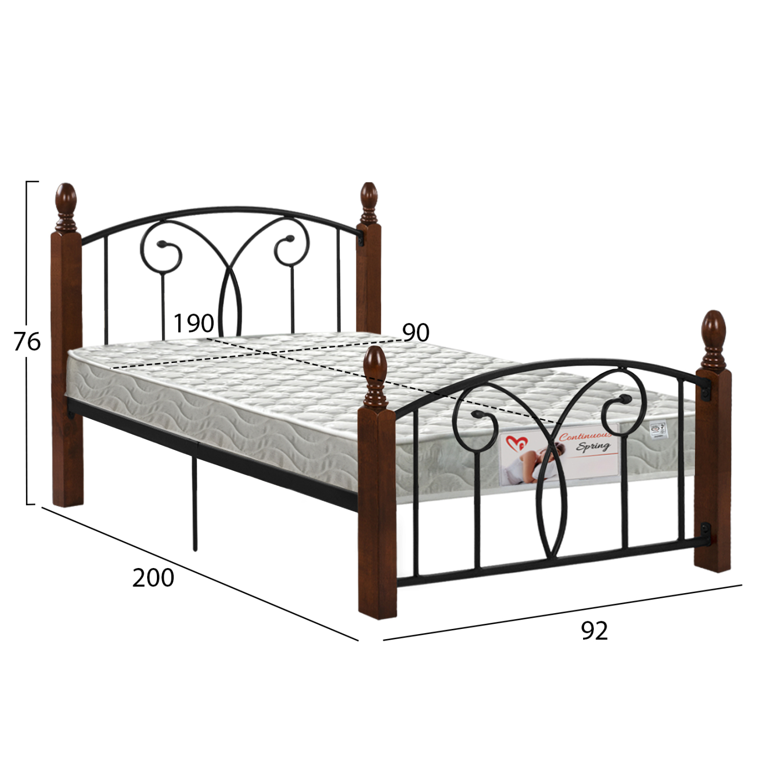 •Το κρεβάτι SUZIE σε διάσταση μονού στρώματος, είναι μια σύνθεση μετάλλου σε ΜΑΥΡΟ χρώμα και ξύλου σε απόχρωση ΚΑΡΥΔΙ. Τα 4 πόδια-κολώνες είναι τα ξύλινα κομμάτια της σύνθεσης, ενώ όλο το υπόλοιπο είναι μεταλλικό.