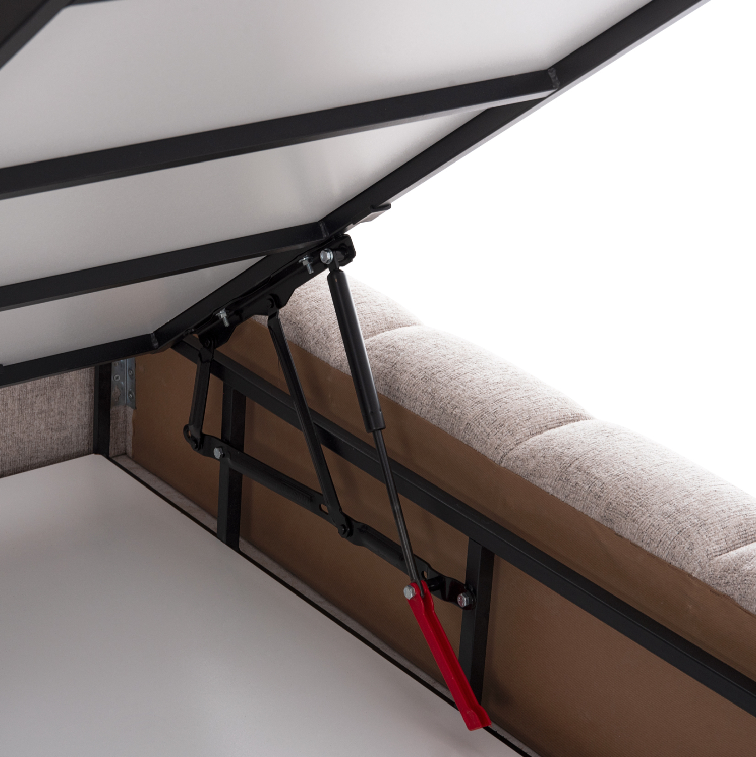Το RAMON είναι ένα κρεβάτι που θα αγαπήσετε με την πρώτη ματιά! Το κεφαλάρι είναι ψηλό με τεχνοτροπία καπιτονέ από «ζεστό» και εντυπωσιακό ύφασμα TEDDY σε ΜΠΕΖ χρώμα. Τα πλαϊνά του κρεβατιού αλλά και το ποδαρικό είναι ίδιας αισθητικής με το κεφαλάρι και «αγκαλιάζουν» το στρώμα! Όμως, το κύριο χαρακτηριστικό αυτού του κρεβατιού είναι ότι δεν ακολουθεί την κλασική κατασκευή με τις τάβλες του σομιέ για την στήριξη του στρώματος, αλλά αντίθετα αποτελείται από μια συνεχόμενη επιφάνεια (2 μοριοσανίδες), πάνω στις οποίες τοποθετείται το στρώμα! Επιπλέον, η κάθε επιφάνεια από μοριοσανίδα ανασηκώνεται με μεταλλικό μηχανισμό ασφαλείας με 4 αμορτισέρ και διαφανείς πλαστικές λαβές προσφέροντας έναν μεγάλο αποθηκευτικό χώρο. Σε διπλή διάσταση στρώματος 160×200 εκ. θα χωρέσει κάθε σας όνειρο!