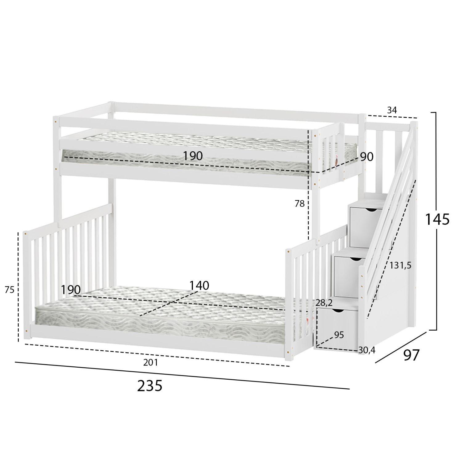 Η παιδική κουκέτα BEAMER σε διάσταση για στρώματα 90 και 140×190εκ, είναι κατασκευασμένη από ξύλο πεύκου σε ΛΕΥΚΟ χρώμα. Η πρόσβαση στο επάνω κρεβάτι γίνεται με πρακτική πλαϊνή σκάλα, ενώ το κάτω κρεβάτι είναι μεγαλύτερο σε πλάτος και πατάει απευθείας στο πάτωμα. Τα στρώματα τοποθετούνται σε τάβλες από κόντρα-πλακέ ξυλεία.