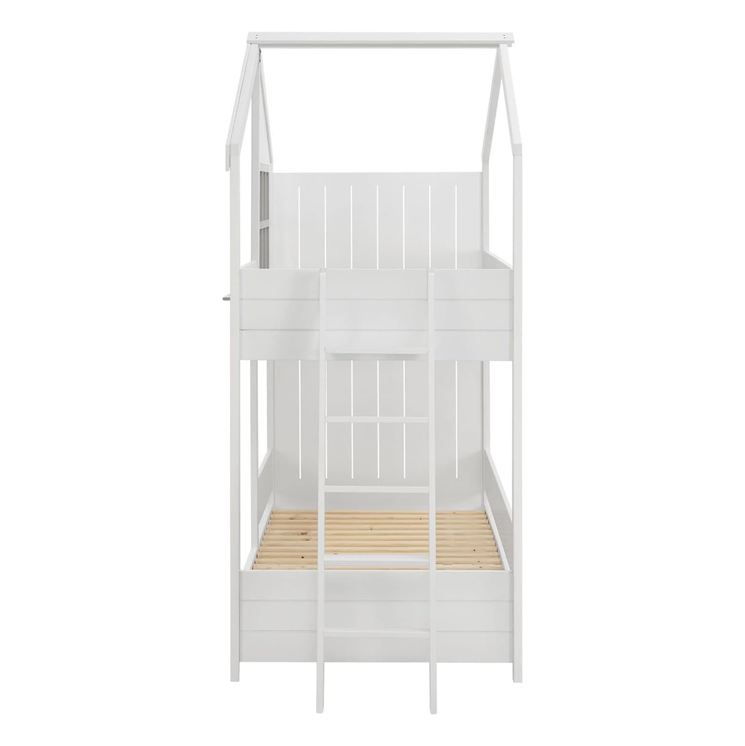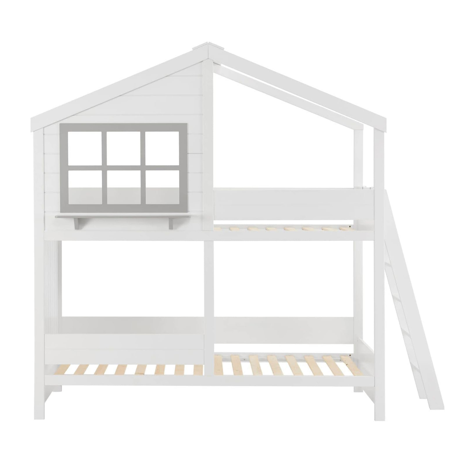 Η παιδική κουκέτα COMBO σε διάσταση για στρώματα 90×190εκ, είναι κατασκευασμένη από ξύλο πεύκου σε ΛΕΥΚΟ χρώμα. Η κουκέτα που έχει σχήμα σπιτιού με παράθυρο διαθέτει περιμετρικά κάγκελα και πλαϊνή σκάλα πρόσβασης στο επάνω κρεβάτι, ενώ τα στρώματα τοποθετούνται σε τάβλες από κόντρα-πλακέ ξυλεία.