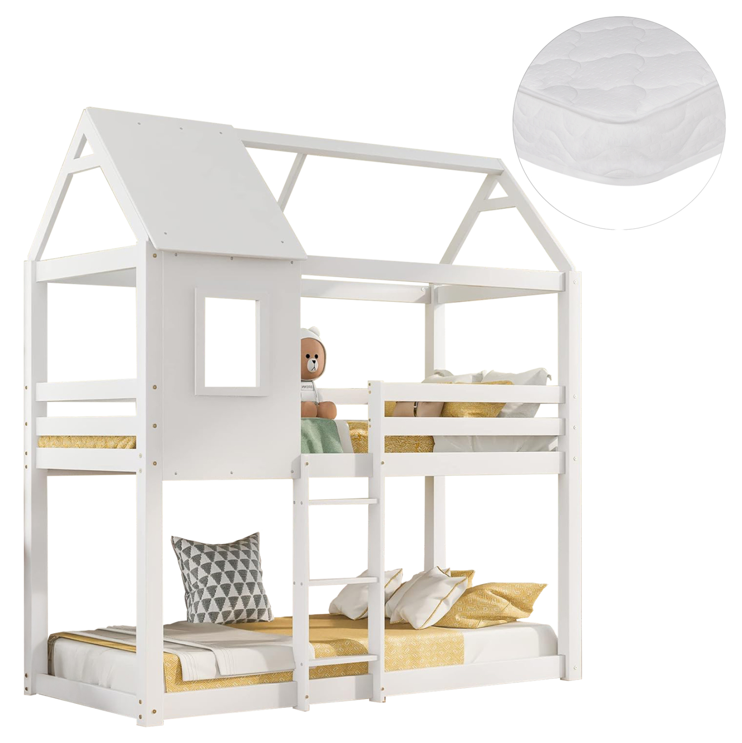 Η παιδική κουκέτα HOOD σε διάσταση για στρώματα 90×190εκ, είναι κατασκευασμένη από ξύλο πεύκου σε ΛΕΥΚΟ χρώμα. Η κουκέτα που πατάει απευθείας στο πάτωμα, διαθέτει περιμετρικά κάγκελα στο επάνω κρεβάτι και σκάλα πρόσβασης, ενώ τα στρώματα τοποθετούνται σε τάβλες από κόντρα-πλακέ ξυλεία. Η κουκέτα έχει σχήμα σπιτάκι και μάλιστα το επάνω κρεβάτι έχει κι ένα παραθυράκι που θα εξάψει την φαντασία των παιδιών.