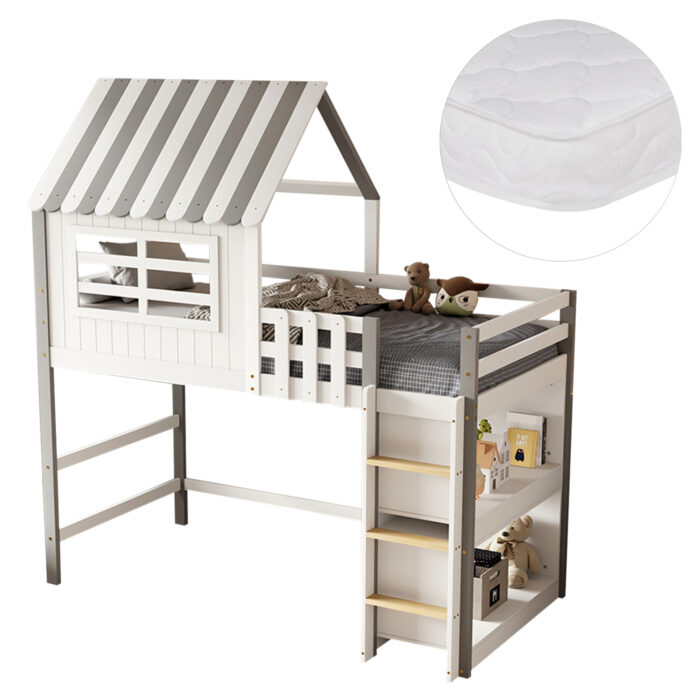 Η παιδική κουκέτα HOMI σε διάσταση για στρώμα 90×190εκ, είναι κατασκευασμένη από ξύλο πεύκου σε ΛΕΥΚΟ/ΓΚΡΙ χρώμα. Η κουκέτα που έχει σχήμα σαν σπιτάκι με παράθυρο διαθέτει περιμετρικά κάγκελα στο επάνω κρεβάτι και κάθετη σκάλα πρόσβασης, ενώ το στρώμα τοποθετείται σε τάβλες από κόντρα-πλακέ ξυλεία. Το κάτω μέρος είναι άδειο (δίνοντάς σας την δυνατότητα να εκμεταλλευτείτε τον χώρο όπως εσείς επιθυμείτε) με δύο ράφια τοποθετημένα στην δεξιά πλευρά πίσω από την σκάλα.