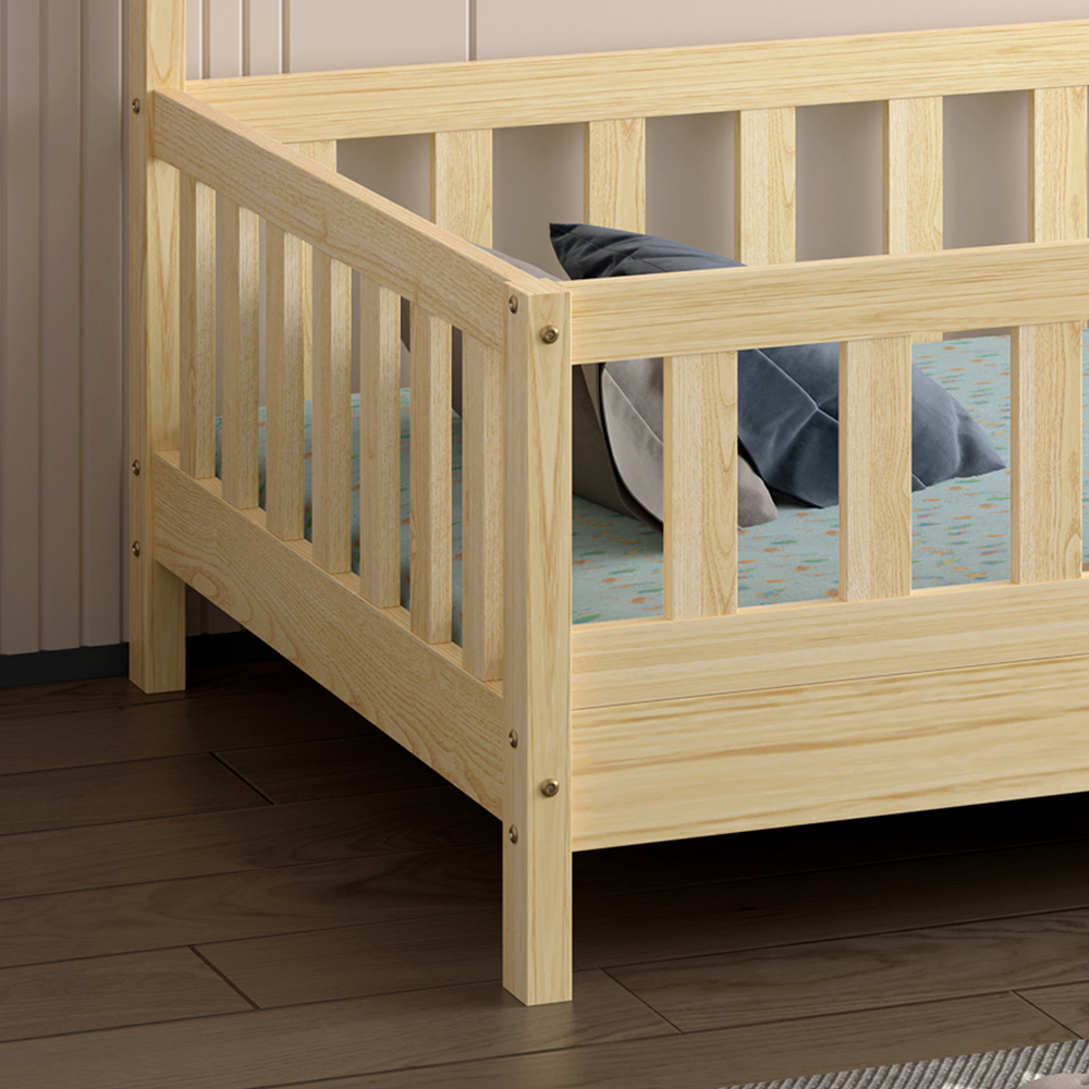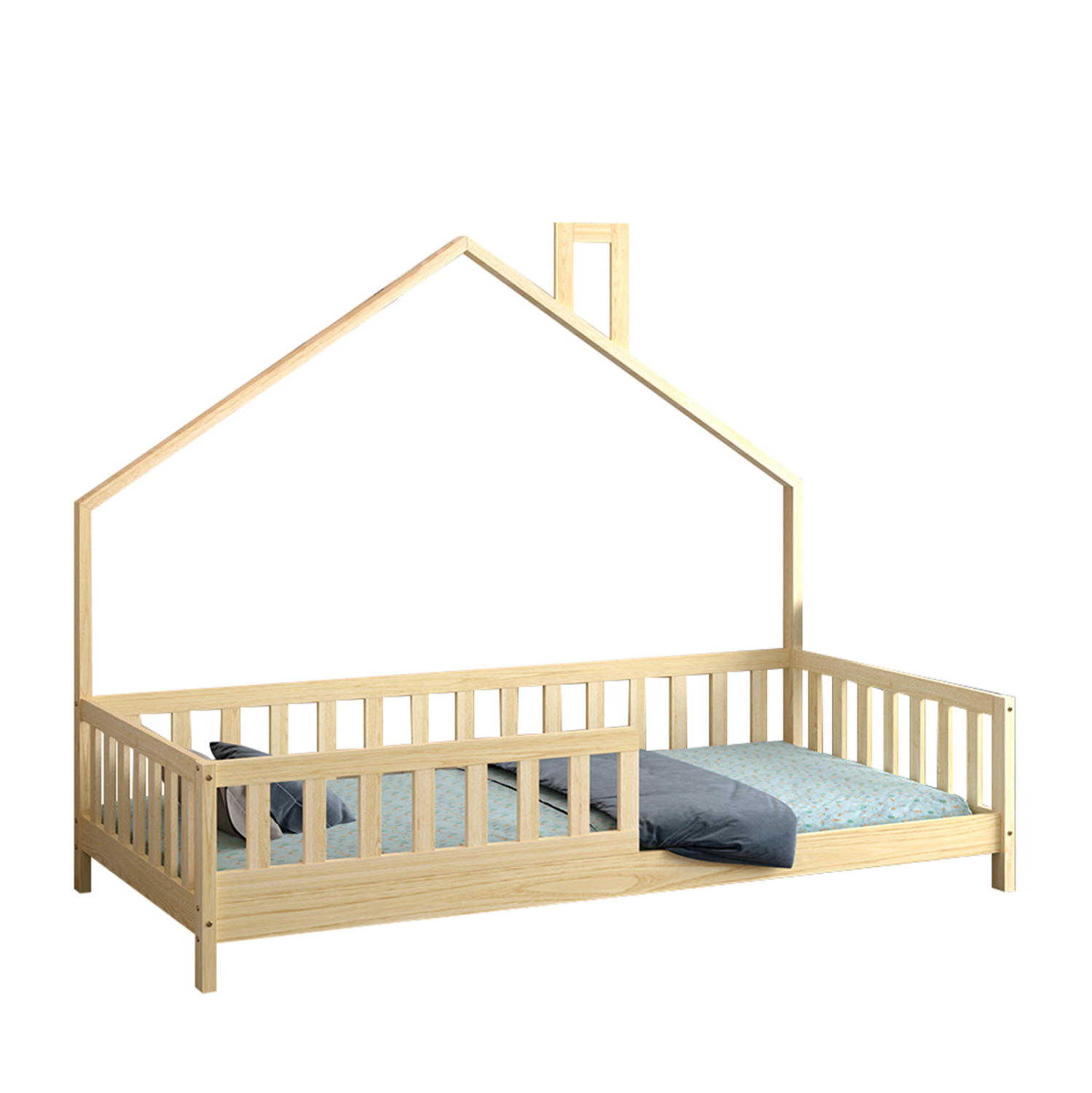 Σας παρουσιάζουμε το καινούργιο παιδικό κρεβάτι HOUSER. Είναι σε διάσταση για μονό στρώμα 90×190 εκ, και αποτελεί μια άριστης ποιότητας, κλασική και ασφαλή επιλογή για το παιδικό δωμάτιο μιας και είναι τύπου Montessori, που σημαίνει ότι έχει σχεδιαστεί σύμφωνα με το εκπαιδευτικό σύστημα Montessori, σύμφωνα με το οποίο τα παιδιά μαθαίνουν καλύτερα, όταν επιλέγουν μόνα τους τι θα κάνουν. Το χαμηλό ύψος κρεβατιού με τα χαμηλά πόδια, βοηθά να εξερευνούν την αυτονομία τους και να ανεβοκατεβαίνουν από το κρεβάτι τους ελεύθερα ανά πάσα στιγμή. Είναι ξύλινο σε ΦΥΣΙΚΟ χρώμα βαμμένο με αβλαβές μη τοξικό βερνίκι με βάση το νερό, ιδανικό για παιδιά. Το στρώμα τοποθετείται σε τάβλες κατασκευασμένες από ξυλεία κόντρα πλακέ. Η μία πλευρά του κρεβατιού έχει την φιγούρα σπιτιού με καμινάδα που θα δώσει μια ευχάριστη, «ζεστή», και παιχνιδιάρικη όψη σε κάθε παιδικό δωμάτιο, ενώ διαθέτει κάγκελα περιμετρικά.