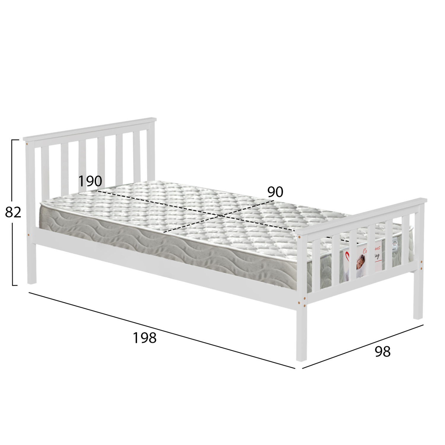 Το παιδικό κρεβάτι GIMLY σε διάσταση για στρώμα 90×190 εκ, είναι κατασκευασμένο από ξύλο πεύκου σε ΛΕΥΚΟ χρώμα, με ψηλά πόδια, ενώ το στρώμα τοποθετείται σε τάβλες από κόντρα-πλακέ ξυλεία.