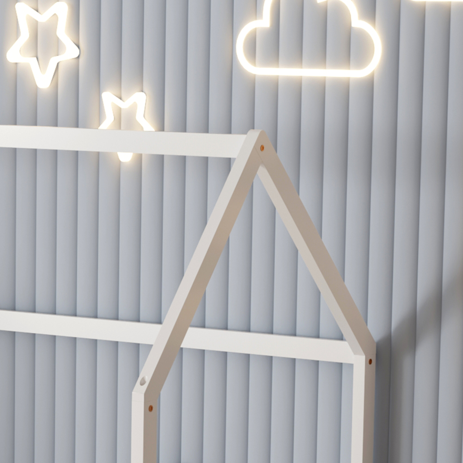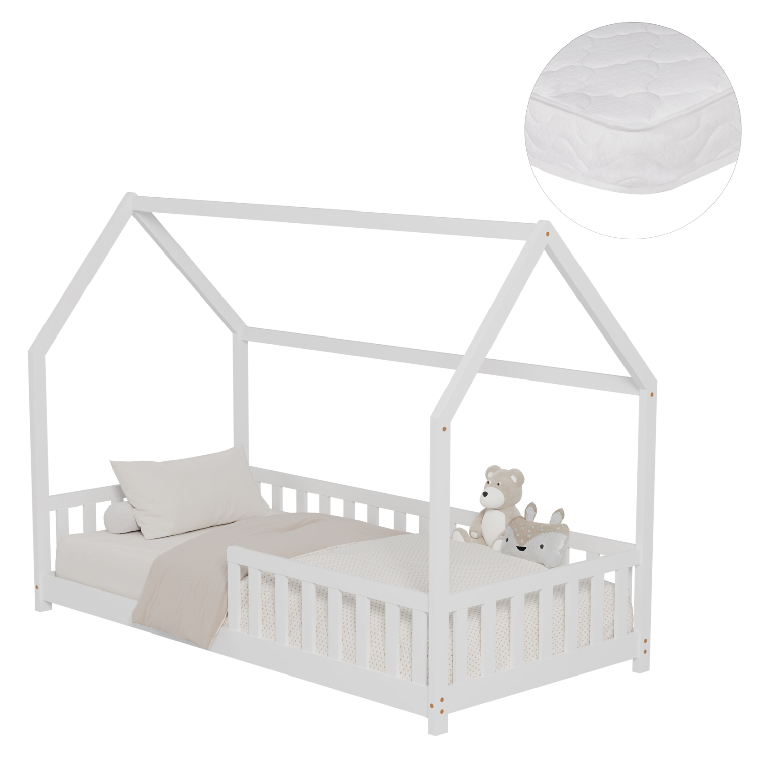 Το παιδικό κρεβάτι PHYLLIS τύπου Montessori σε διάσταση για στρώμα 90×190εκ, είναι κατασκευασμένο από ξύλο πεύκου σε ΛΕΥΚΟ χρώμα. Όλο το κρεβάτι έχει σχήμα σπιτιού με εξαιρετικά χαμηλά πόδια και περιμετρικά κάγκελα, ενώ το στρώμα τοποθετείται σε τάβλες από κόντρα-πλακέ ξυλεία.