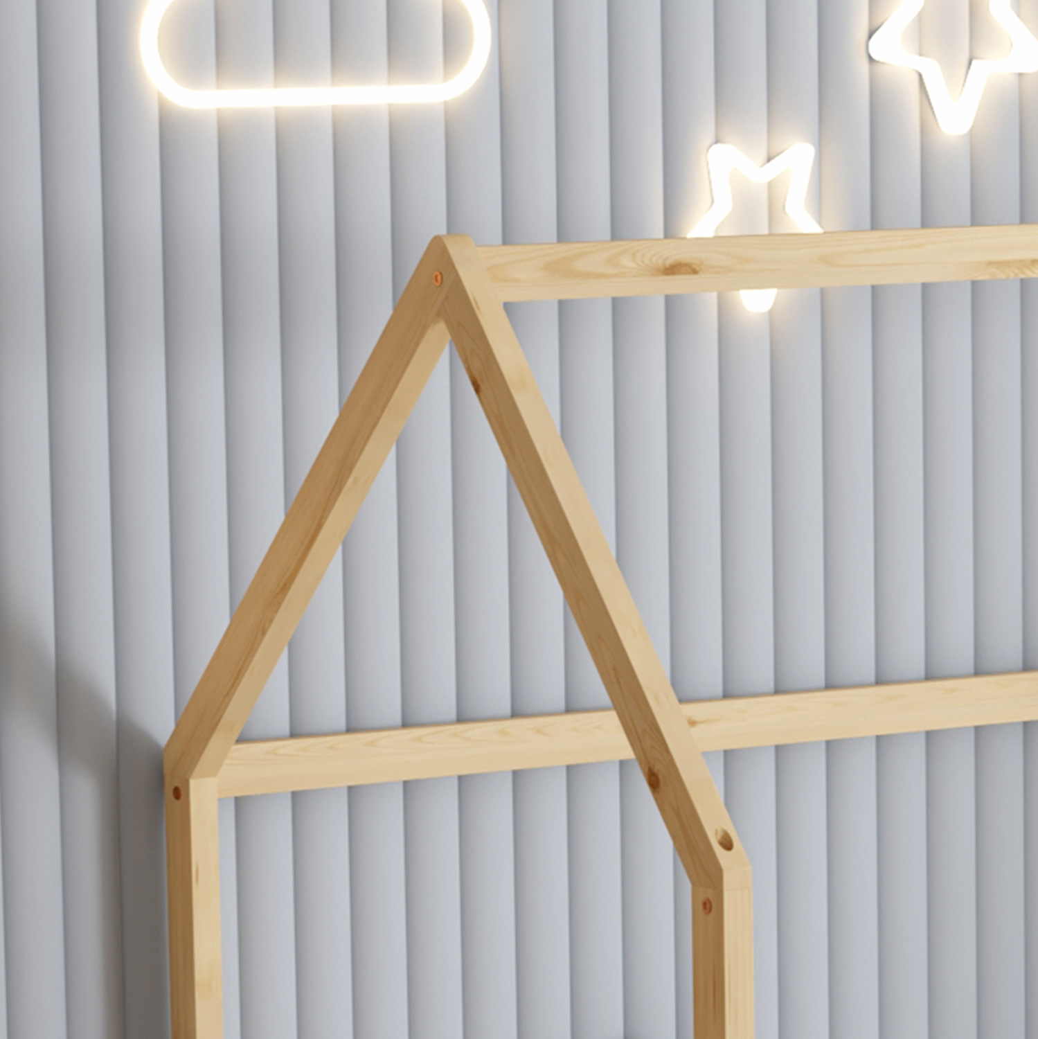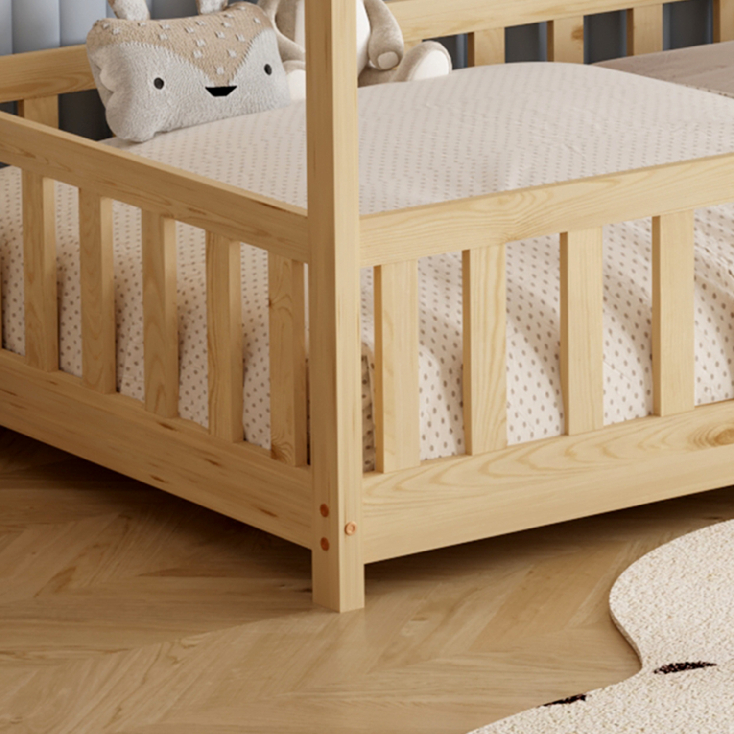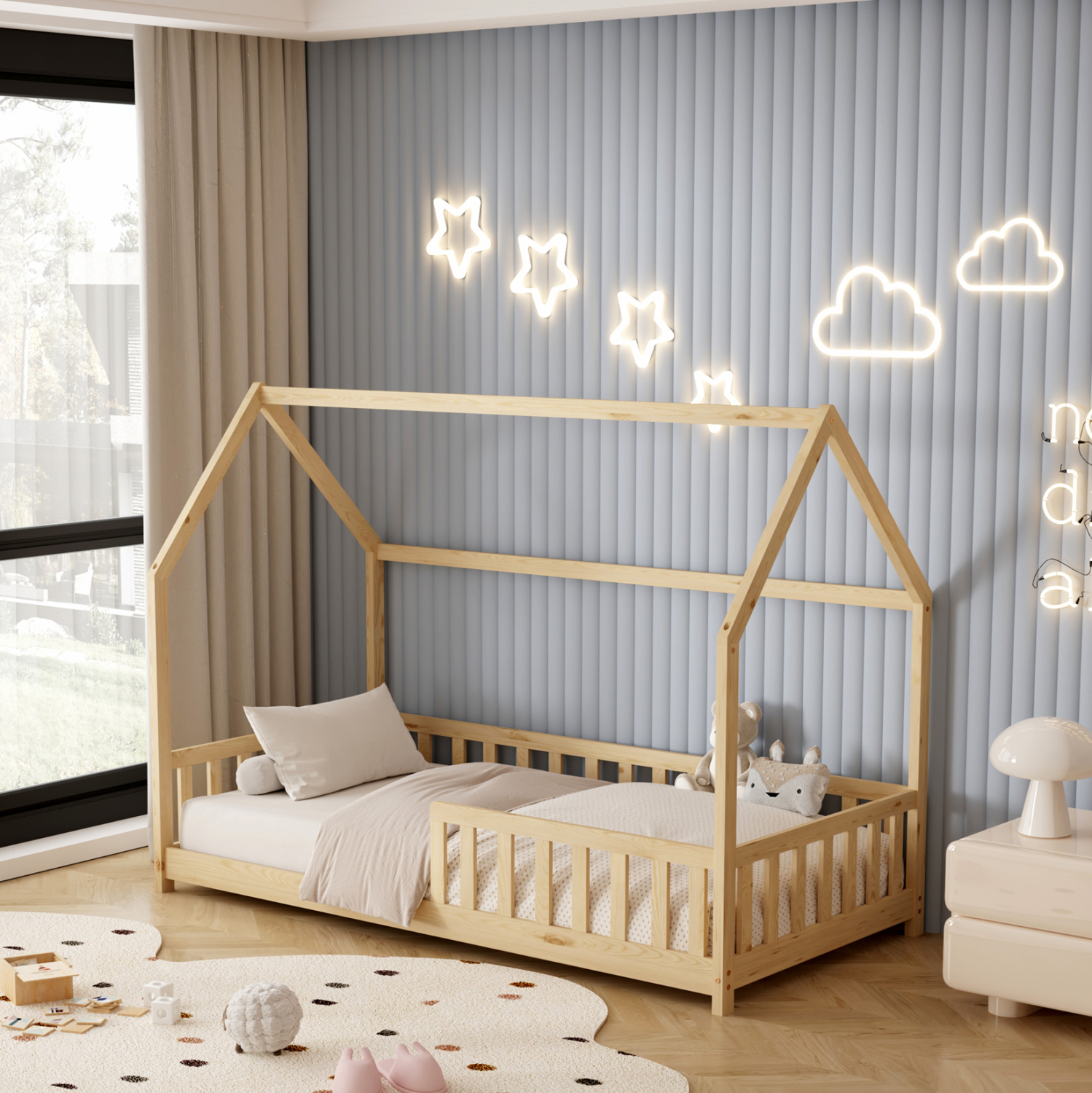 Το παιδικό κρεβάτι PHYLLIS τύπου Montessori σε διάσταση για στρώμα 90×190εκ, είναι κατασκευασμένο από ξύλο πεύκου σε ΦΥΣΙΚΟ χρώμα. Όλο το κρεβάτι έχει σχήμα σπιτιού με εξαιρετικά χαμηλά πόδια και περιμετρικά κάγκελα, ενώ το στρώμα τοποθετείται σε τάβλες από κόντρα-πλακέ ξυλεία.