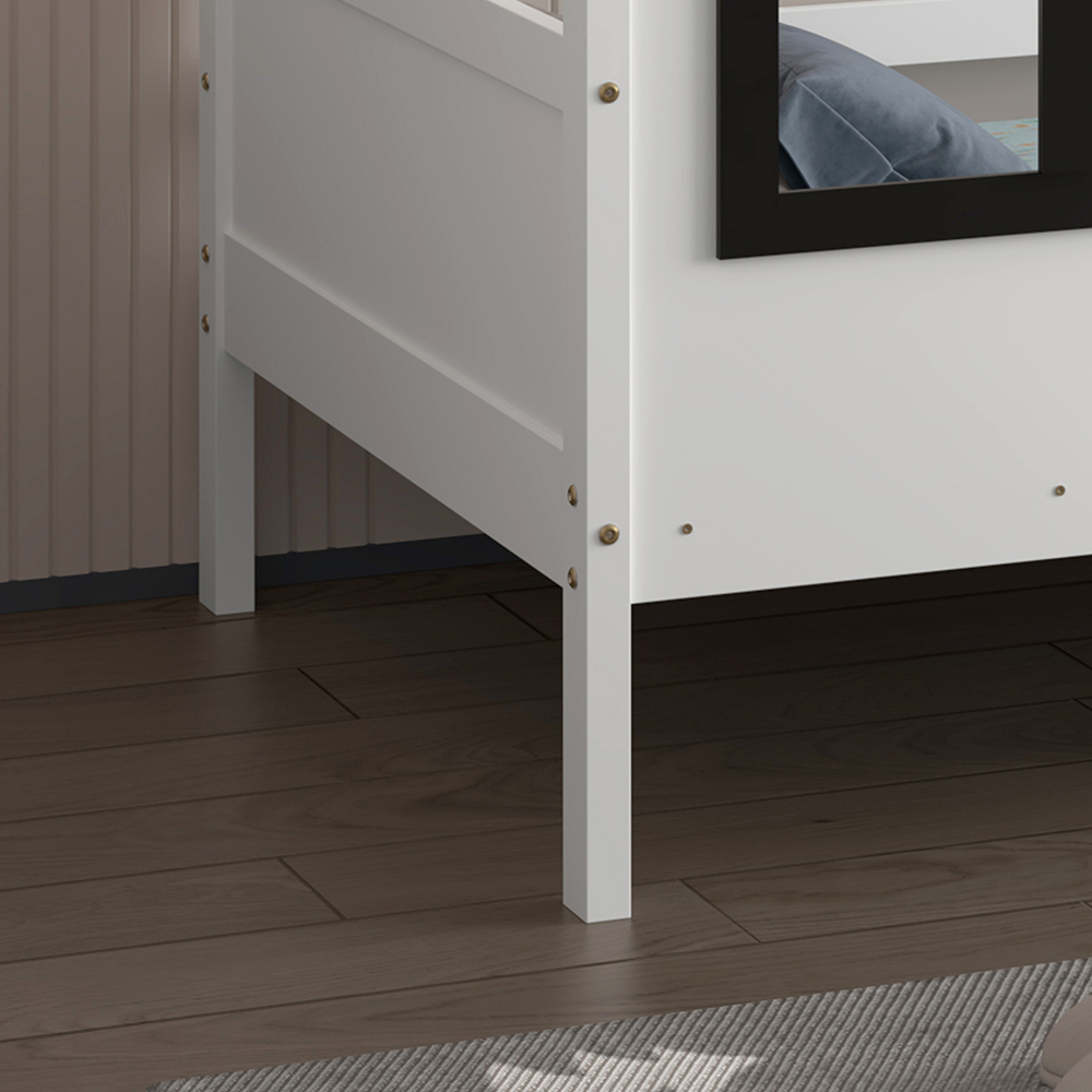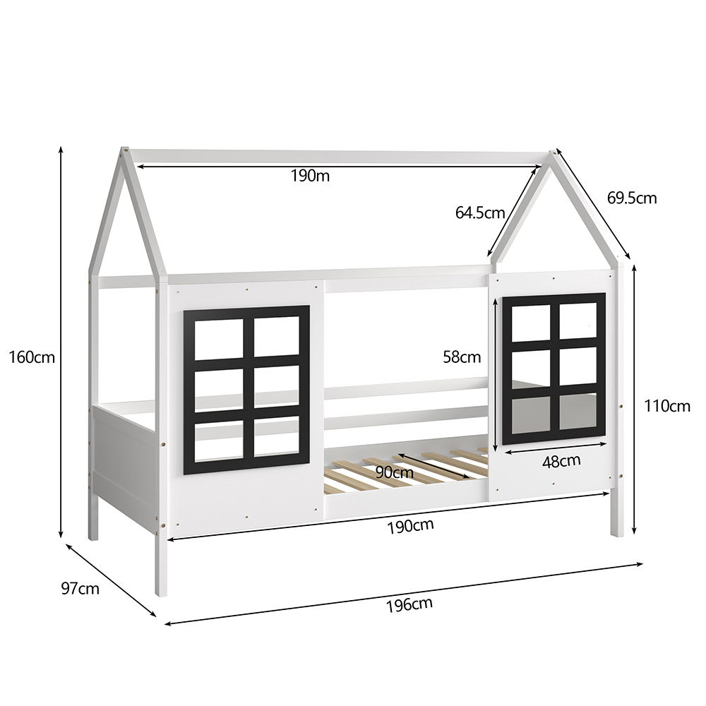 Το DOMER είναι ακόμα ένα καινούργιο παιδικό κρεβάτι τύπου Montessori που σημαίνει ότι έχει σχεδιαστεί σύμφωνα με το εκπαιδευτικό σύστημα Montessori, κατά το οποίο τα παιδιά μαθαίνουν καλύτερα, όταν επιλέγουν μόνα τους τι θα κάνουν. Το κρεβάτι διαθέτει σχετικά ψηλά πόδια, και είναι σε διάσταση για μονό στρώμα 90×190 εκ, αποτελώντας μια άριστης ποιότητας, μοντέρνα και ασφαλή επιλογή για το παιδικό δωμάτιο. Είναι ξύλινο σε ΛΕΥΚΟ χρώμα βαμμένο με αβλαβές μη τοξικό βερνίκι με βάση το νερό, ιδανικό για παιδιά. Το στρώμα τοποθετείται σε τάβλες κατασκευασμένες από ξυλεία κόντρα πλακέ. Ολόκληρο το κρεβάτι έχει σχήμα σπιτιού με 2 παραθυράκια σε ΜΑΥΡΟ χρώμα, που θα δώσει μια ευχάριστη, «ζεστή», και παιχνιδιάρικη όψη σε κάθε παιδικό δωμάτιο.