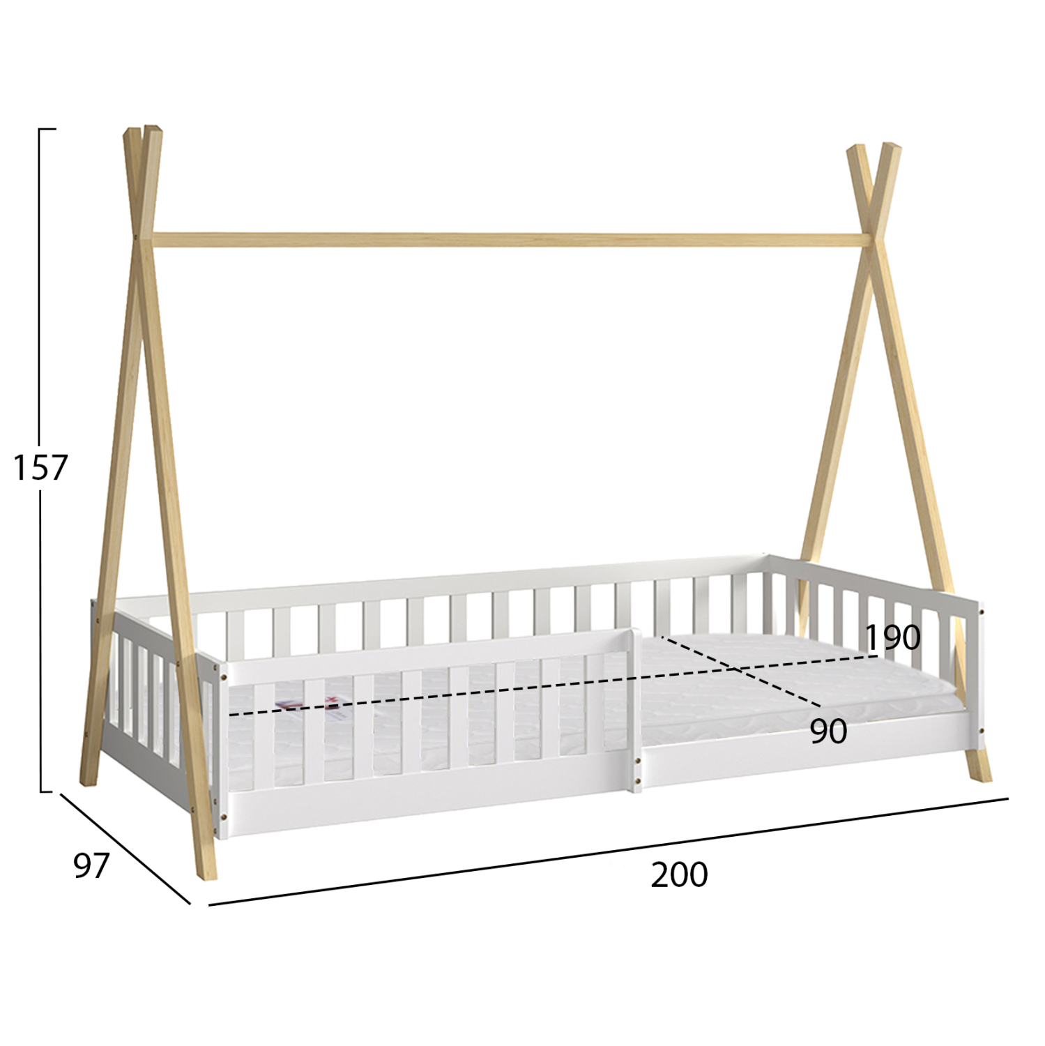 Παιδικό κρεβάτι σε σχήμα σκηνής τύπου Montessori, με περιμετρικό κάγκελο—ΞΥΛΟ ΠΕΥΚΟΥ σε ΛΕΥΚΟ-ΦΥΣΙΚΟ χρώμα.