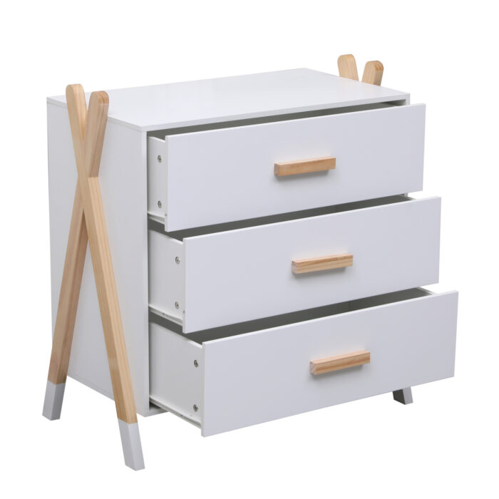 Η PASCHAL είναι μια καινούργια παιδική συρταριέρα σε ΛΕΥΚΟ χρώμα. Είναι βολική σε διαστάσεις και διαθέτει 3 συρτάρια. Στηρίζεται σε δύο ξύλινα χιαστί πόδια σε ΦΥΣΙΚΟ χρώμα ξύλου στις δύο πλευρές. Είναι βαμμένη με αβλαβές μη τοξικό βερνίκι με βάση το νερό, ιδανικό για παιδιά.