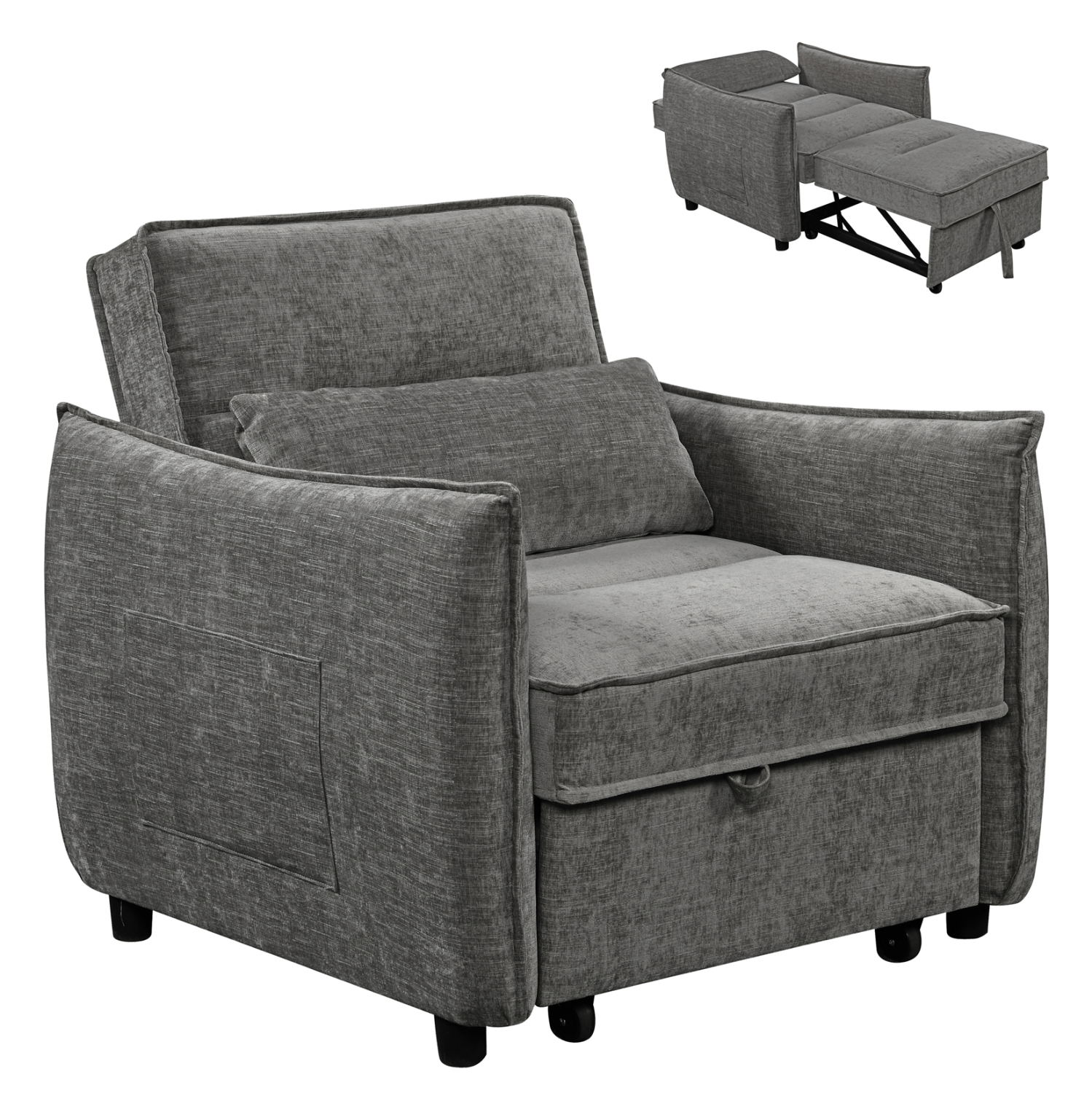 Η πολυθρόνα-κρεβάτι ORYN συνδυάζει άνεση, πρακτικότητα και ευελιξία. Επενδυμένη με ΓΚΡΙ ύφασμα, ενσωματώνει συρόμενο, τραβηχτό ράντζο με ιμάντα και ροδάκια, το οποίο ανασηκώνεται μέσω ειδικού μηχανισμού κατά την ανάπτυξη. Η πλάτη προσφέρει δύο επιλογές χρήσης, καθώς μπορεί είτε να παραμείνει όρθια είτε να πέσει, ανάλογα με την επιθυμητή θέση ξεκούρασης, ενώ στην εξωτερική πλευρά των μπράτσων υπάρχει θήκη για τοποθέτηση διάφορων αντικειμένων.