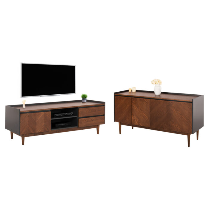 Η σύνθεση/σετ 2τμχ ΒEEN αποτελείται από έναν μπουφέ κι ένα έπιπλο τηλεόρασης με παρόμοια αισθητική. Διαθέτουν ψηλά πόδια και είναι κατασκευασμένα από MDF με καπλαμά από ξύλο καρυδιάς και φράξινου.