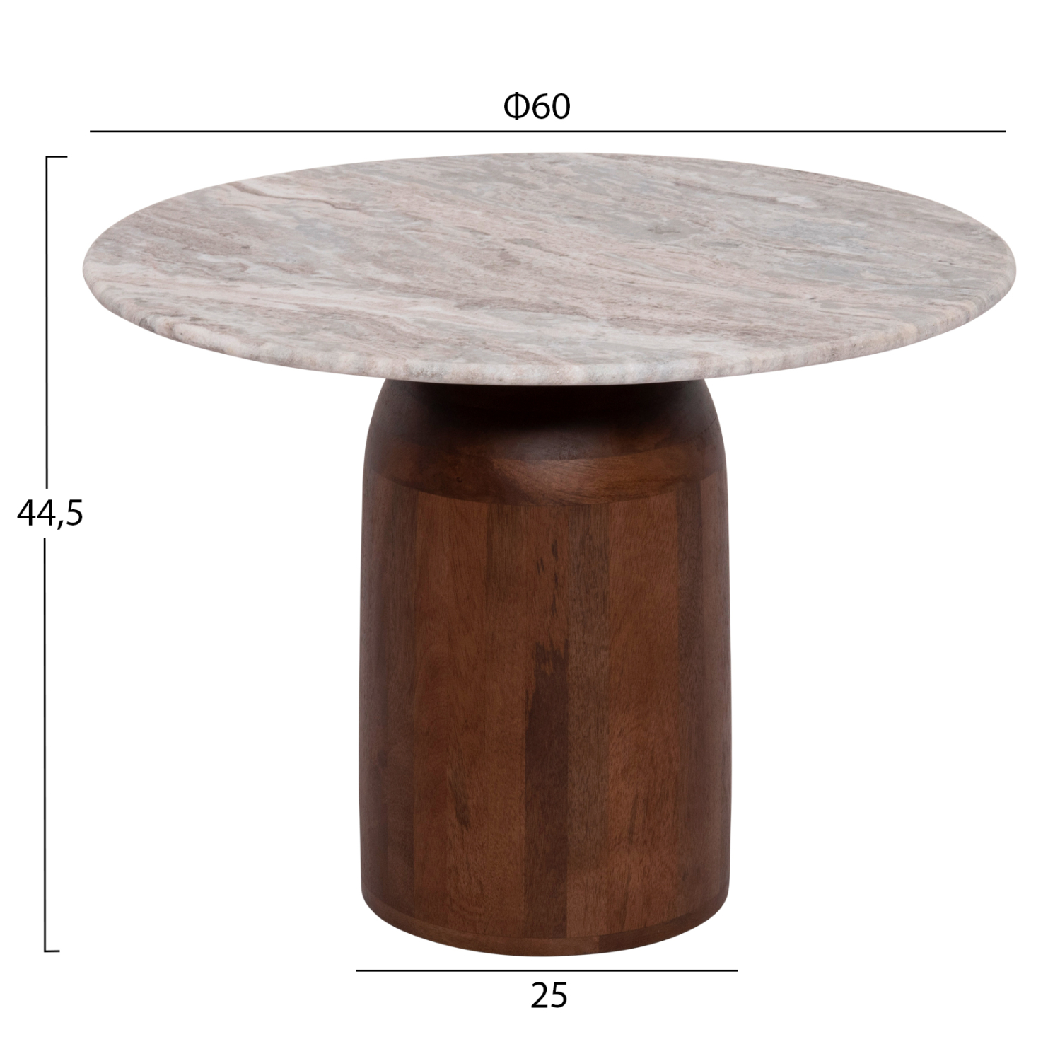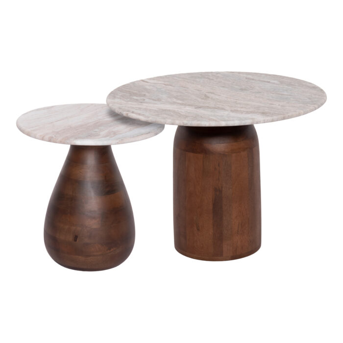 Το σετ 2τμχ MALED αποτελείται από 2 κομψά στρογγυλά τραπέζια για το σαλόνι με επιφάνεια από ΛΕΥΚΟ ΜΑΡΜΑΡΟ. Αυτές οι επιφάνειες, βιδώνονται σε ένα μεταλλικό δίσκο, ο οποίος στηρίζεται σε μια κυλινδρική βάση από ποιοτικό ξύλο mango σε ΚΑΡΥΔΙ χρώμα.