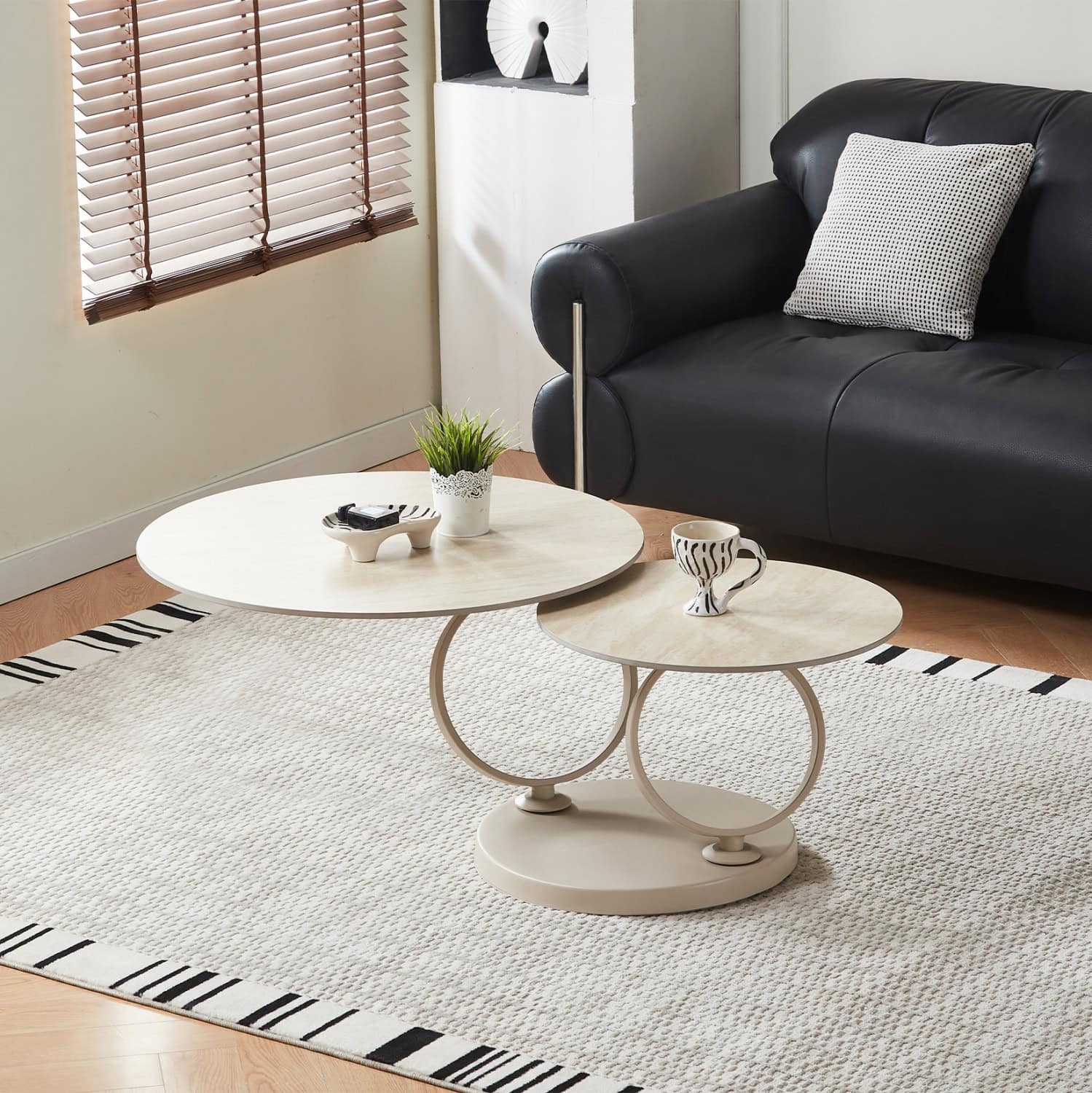 Το τραπέζι σαλονιού NUBISA ξεχωρίζει για τον σύγχρονο, γλυπτικό σχεδιασμό του και τον δυναμικό συνδυασμό υλικών. Η μεταλλική ΜΠΕΖ βάση με καμπύλες γραμμές λειτουργεί ως ενιαίο αρχιτεκτονικό στοιχείο, ενώ οι δύο επιφάνειες από sintered stone στο χρωματικό σχήμα πέτρας ΤΡΑΒΕΡΤΙΝΑΣ μπορούν με μια κίνηση να γίνουν μία επιφάνεια καθώς η δεύτερη «μαζεύεται» κάτω από την μεγάλη με μια περιστροφική κίνηση!