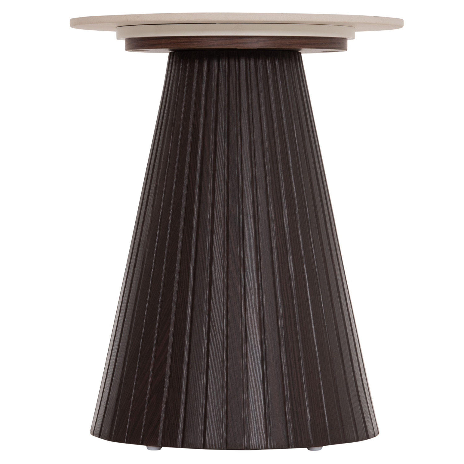 Το βοηθητικό τραπέζι CATER είναι στρογγυλό και αποτελεί νέα προσθήκη στην γκάμα μας. Η επίπεδη επιφάνειά του είναι κεραμική σε χρωματισμό TRAVERTINE STONE, ενώ η κωνική βάση του είναι κατασκευασμένη εξολοκλήρου από MDF σε χρώμα ΣΚΟΥΡΟ ΚΑΦΕ, με όμορφες πτυχώσεις.