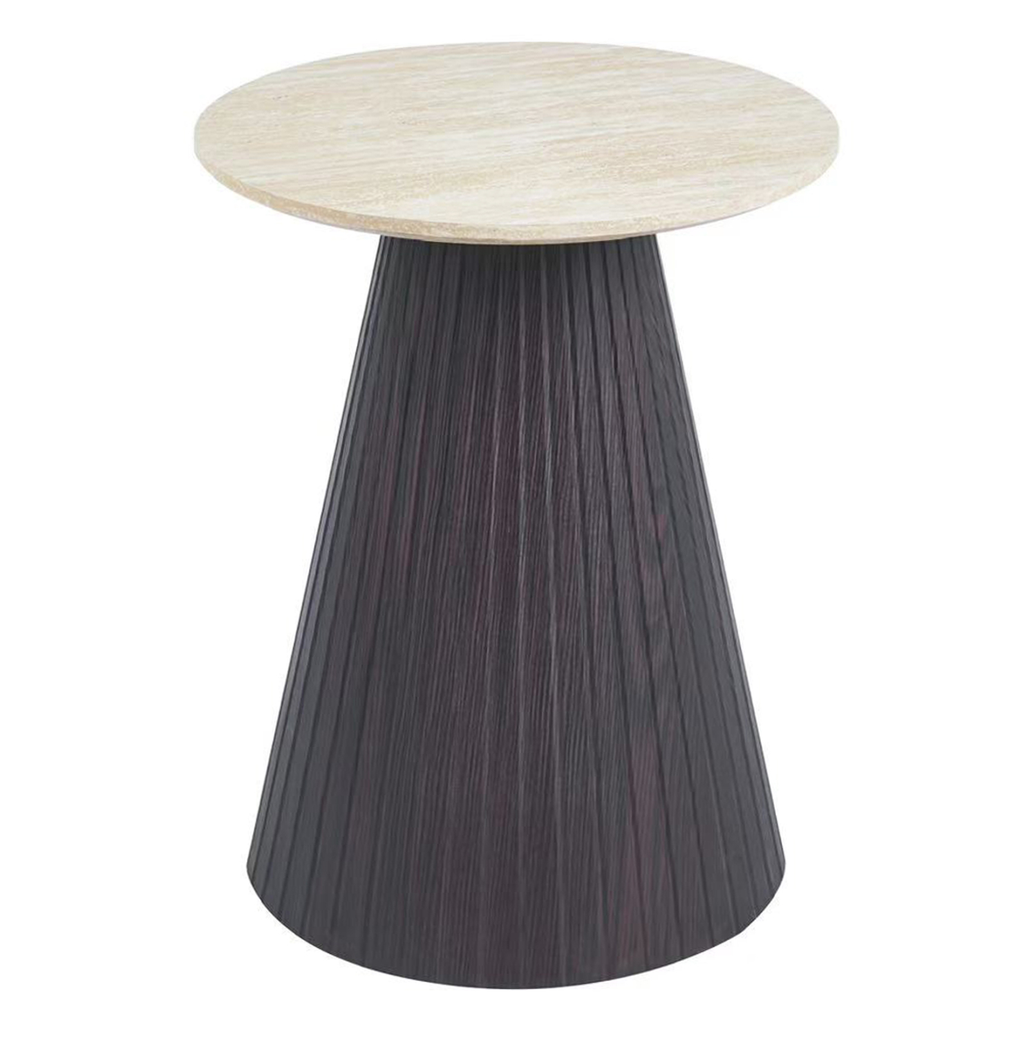 Το βοηθητικό τραπέζι CATER είναι στρογγυλό και αποτελεί νέα προσθήκη στην γκάμα μας. Η επίπεδη επιφάνειά του είναι κεραμική σε χρωματισμό TRAVERTINE STONE, ενώ η κωνική βάση του είναι κατασκευασμένη εξολοκλήρου από MDF σε χρώμα ΣΚΟΥΡΟ ΚΑΦΕ, με όμορφες πτυχώσεις.