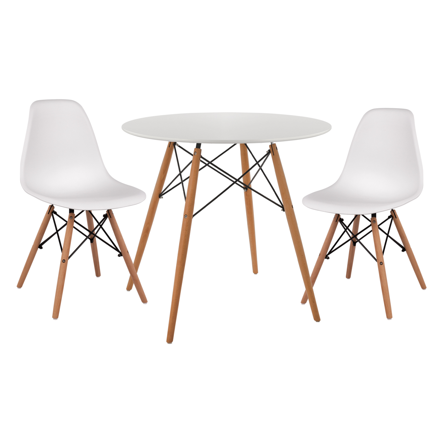 Ένα στρογγυλό τραπέζι με πόδια οξιάς σε ΦΥΣΙΚΟ χρώμα και MDF επιφάνεια σε ΛΕΥΚΟ χρώμα, και 2 καρέκλες με ενιαία πλάτη και κάθισμα από πολυπροπυλένιο σε ΛΕΥΚΟ χρώμα και πόδια οξιάς σε φυσικό χρώμα.