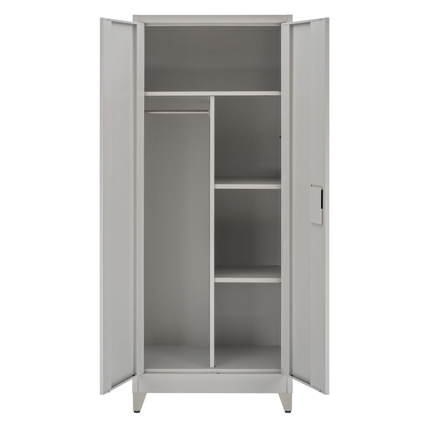 Η δίφυλλη ντουλάπα διαθέτει κλειδαριά ασφαλείας και είναι κατασκευασμένη εξολοκλήρου από μέταλλο με ηλεκτροστατική βαφή, που προστατεύει από φθορές, υγρασία και σκουριά. Επιπροσθέτως, διαθέτει και πόδια ύψους 10 εκατοστών με ρυθμιστές ύψους για εσάς που θέλετε η ντουλάπα να μην «πατάει» απευθείας στο δάπεδο.