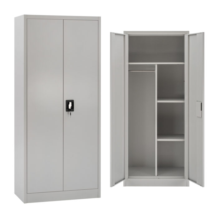 Η ΗΜ5961.01 είναι μια πρακτικότατη μεταλλική ντουλάπα που έχει φτιαχτεί με γνώμονα την χωρητικότητα και την ανθεκτικότητα. Είναι δίφυλλη με τις δύο πόρτες να κλείνουν ακριβώς στην μέση της κατασκευής, ενώ το εσωτερικό είναι χωρισμένο σε 3 κύριους χώρους με μεταλλικό χώρισμα σε σχήμα Τ. Το επάνω μέρος είναι ενιαίο σαν παταράκι, ενώ η μία πλευρά διαθέτει μεταλλική μπάρα για κρέμαση αντικειμένων και η άλλη διαθέτει 2 ράφια που δημιουργούν 3 επίπεδα αποθήκευσης. Οι πόρτες διαθέτουν κλειδαριά που κλειδώνει με κλειδί, ενώ το χρώμα της ντουλάπας είναι πολύ ανοιχτό γκρι.