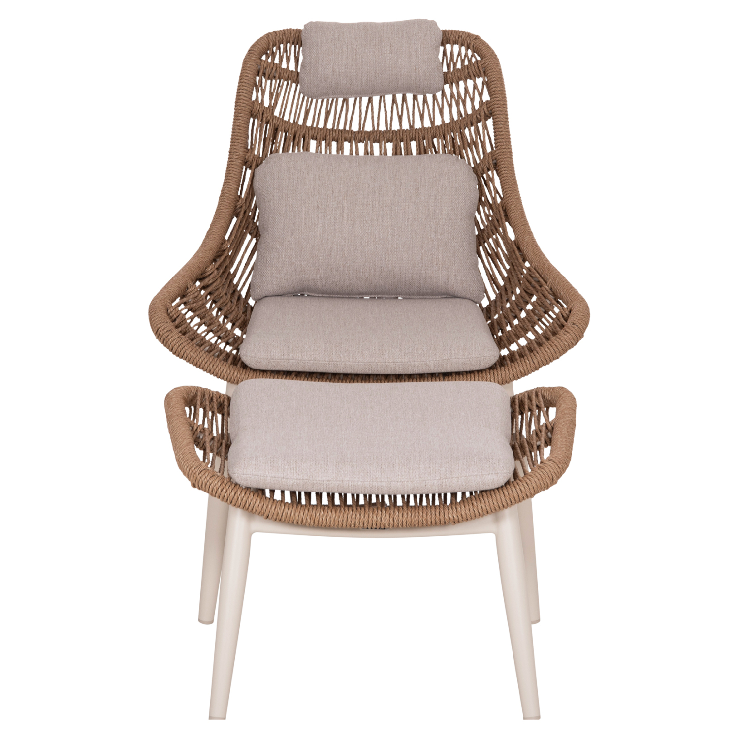 Ο σκελετός από αλουμίνιο σε ανοιχτή μπεζ απόχρωση εξασφαλίζει ανθεκτικότητα και σταθερότητα, ενώ η επένδυση από twist wicker σε φυσικό χρώμα προσδίδει ζεστασιά και διαχρονική αισθητική. Τα άνετα μαξιλάρια καθίσματος, πλάτης και προσκέφαλου, καθώς και το μαξιλάρι του υποποδίου, σε ανοιχτό μπεζ OLEFIN ύφασμα, προσφέρουν εξαιρετική άνεση για πολύωρη χρήση.