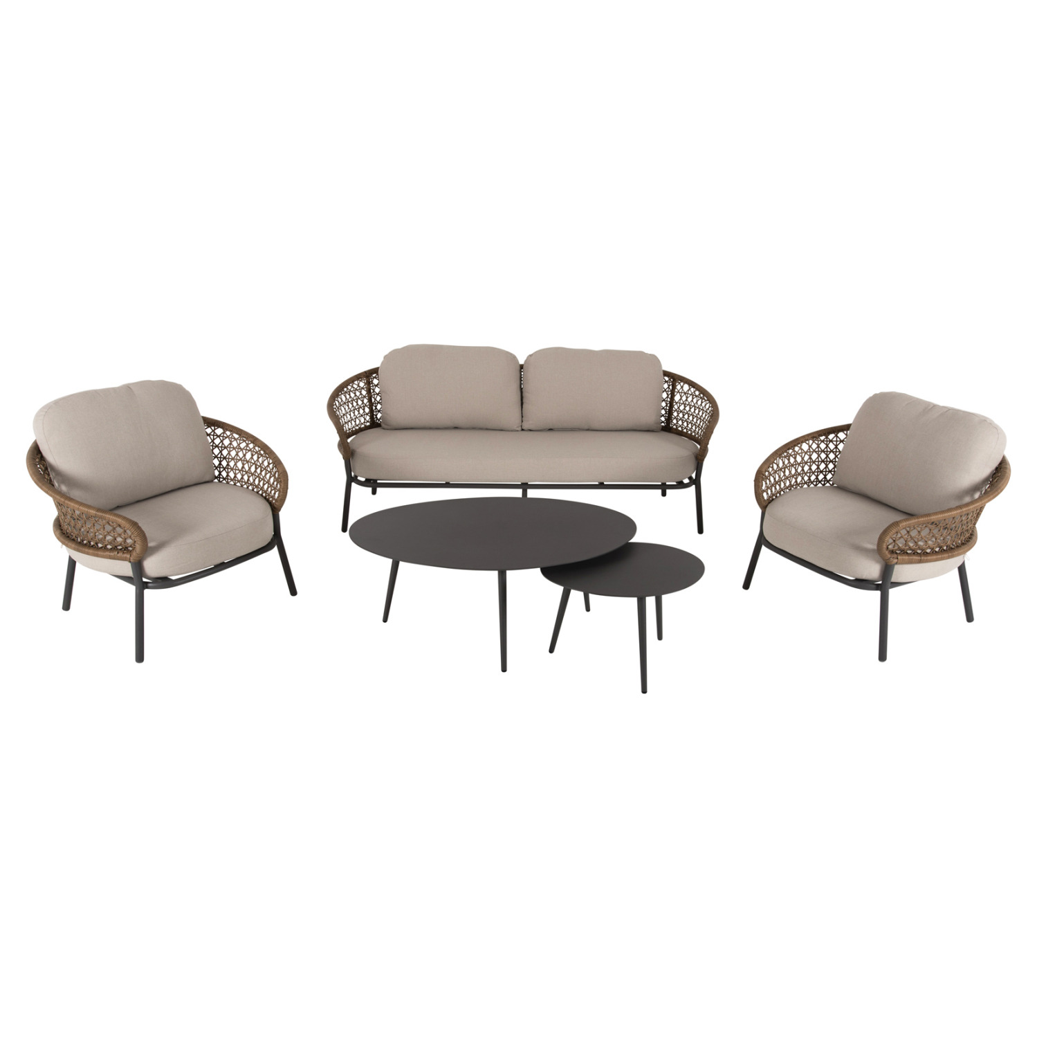 Σας παρουσιάζουμε το όμορφο σετ σαλονιού εξωτερικού χώρου BREY σε συνδυασμό χρωμάτων που θα λατρέψετε, με 2 τραπεζάκια, 2 πολυθρόνες και 1 διθέσιο καναπέ. Ο σκελετός σε όλο το σετ είναι από αλουμίνιο επενδυμένο με συνθετικό RATTAN σε ΧΑΚΙ χρώμα. Το design τους είναι πανέμορφο στην όψη ενώ η στιβαρότητά τους είναι εμφανής. Τα δύο τραπεζάκια με την οβάλ ΓΚΡΙ επιφάνεια είναι πρακτικότατα, ενώ οι πολυθρόνες είναι φαρδιές με πλάτη ημικυκλική και αγκαλιάζουν το σώμα πράγμα που επιτείνει την άνεση που προσφέρουν, σε συνδυασμό με τα αναπαυτικά μαξιλάρια τόσο στο κάθισμα όσο και στην πλάτη. Ο διθέσιος καναπές σε παρόμοιο design είναι, όμως, το πιο εντυπωσιακό κομμάτι αυτού του σετ που τον καθιστούν το σημείο αναφοράς. Τα μαξιλάρια σε όλο το σετ είναι επενδυμένα με πολυεστερικό ύφασμα σε ΜΠΕΖ χρώμα και διαθέτουν γέμισμα με μέτριας σκληρότητας αφρώδη υλικά για την μεγαλύτερη δυνατή άνεση, αλλά και φερμουάρ. Τι άλλο να ζητήσει κανείς για να αναβαθμίσει τον εξωτερικό χώρο της επιχείρησής του;