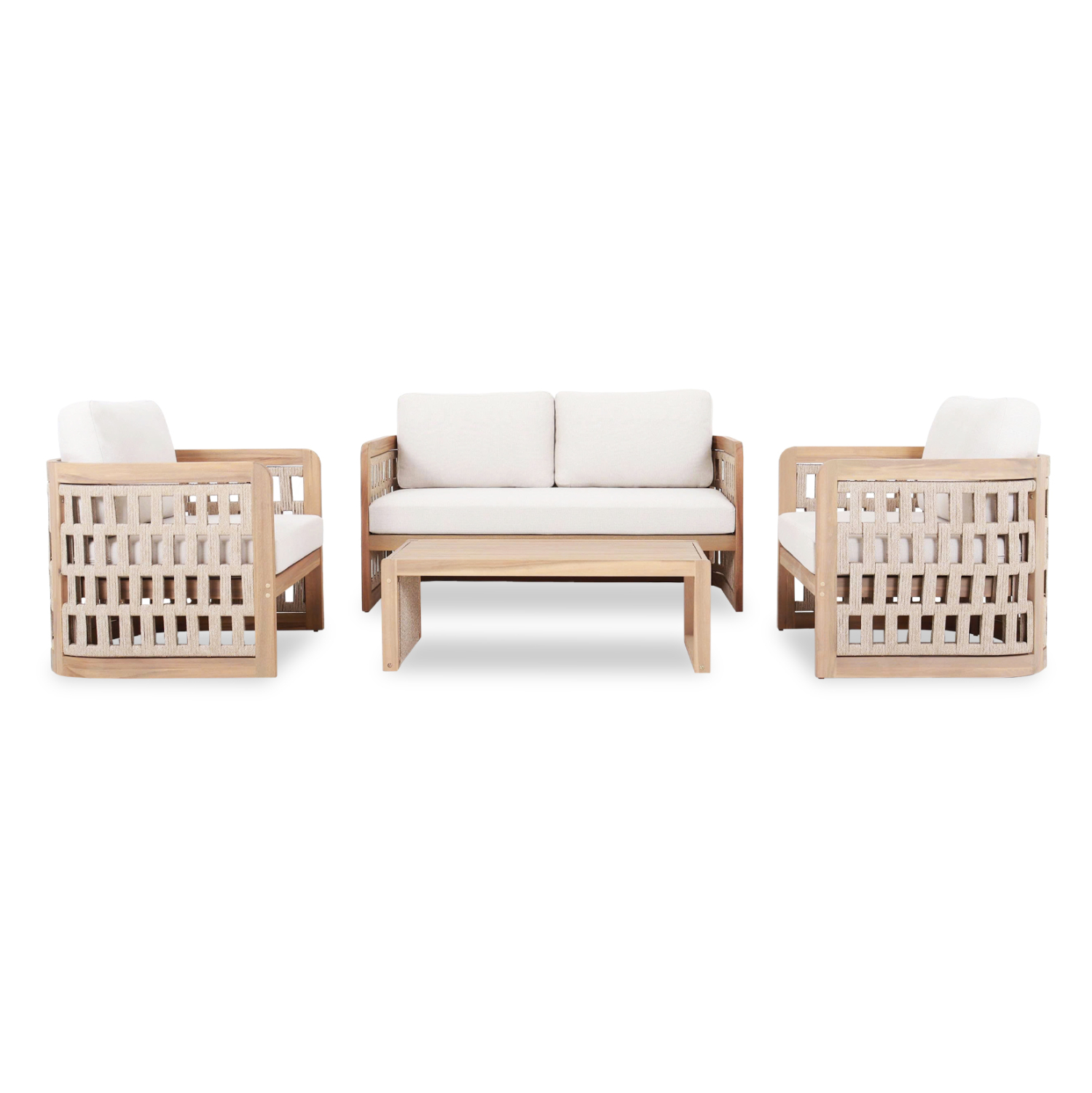 Το σετ σαλόνι εξωτερικού χώρου 4τμχ LUDVALD αποτελείται από έναν 3-θέσιο καναπέ και 2 πολυθρόνες με ημικυκλικό σκελετό επενδυμένο με σχοινί, και ένα ορθογώνιο τραπεζάκι. Ο σκελετός είναι από ξύλο ακακίας σε ΦΥΣΙΚΟ χρώμα με μαξιλάρια σε ΜΠΕΖ χρώμα, ένας συνδυασμός γήινων χρωμάτων που δίνει μια «ζεστή» εικόνα στο σύνολο.