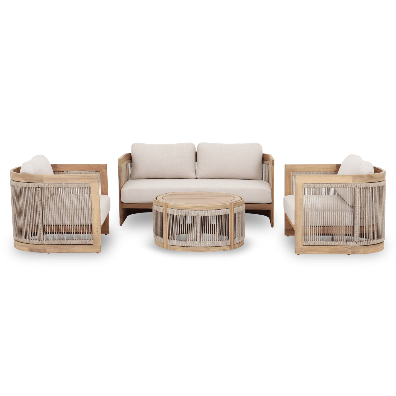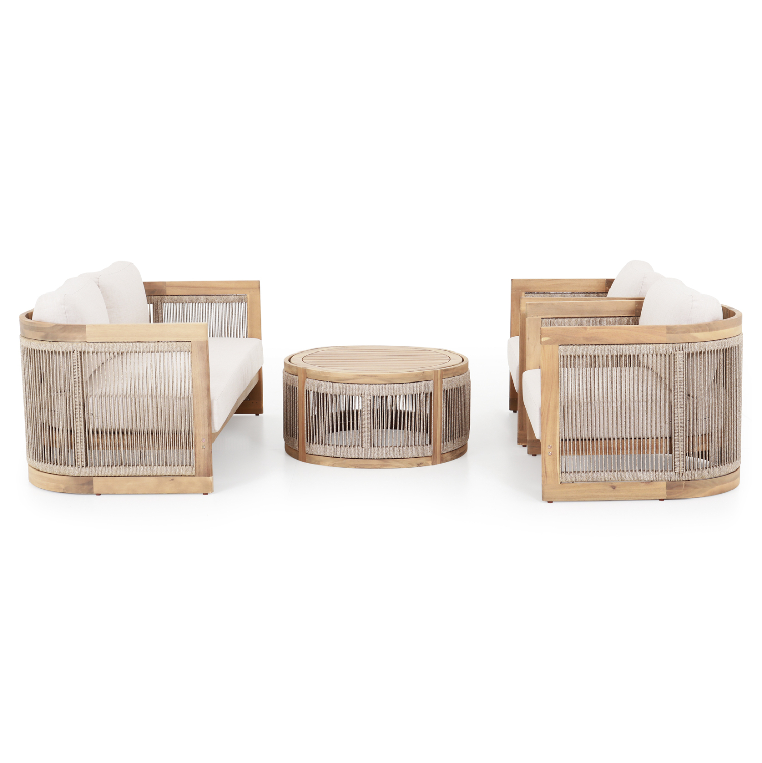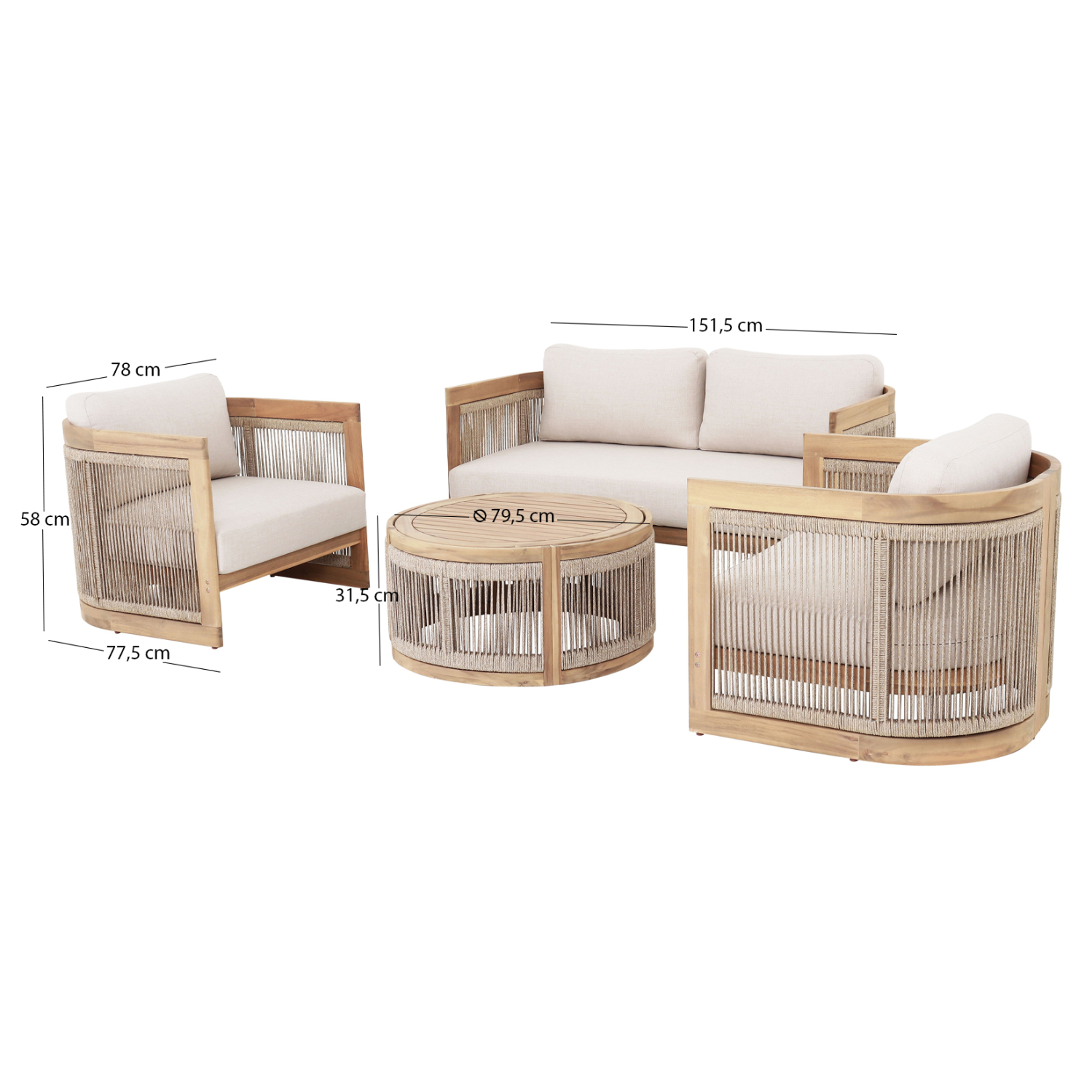 Το σετ σαλόνι εξωτερικού χώρου ODYSSEY είναι η επιτομή της πολυτέλειας συνδυασμένης με απαράμιλλη ποιότητα. Αποτελείται από έναν 2-θέσιο καναπέ, 2 πολυθρόνες, και ένα στρογγυλό τραπεζάκι. Ο σκελετός είναι από ξύλο ακακίας σε ΦΥΣΙΚΟ χρώμα με μαξιλάρια σε ΜΠΕΖ χρώμα, ενώ η επένδυση με σχοινί σε όλα τα κομμάτια του σετ δίνει μια ακόμα πιο «ζεστή» εικόνα στο σύνολο. Η αισθητική και τα γήινα χρώματα θα ταιριάξουν σε κάθε χώρο.