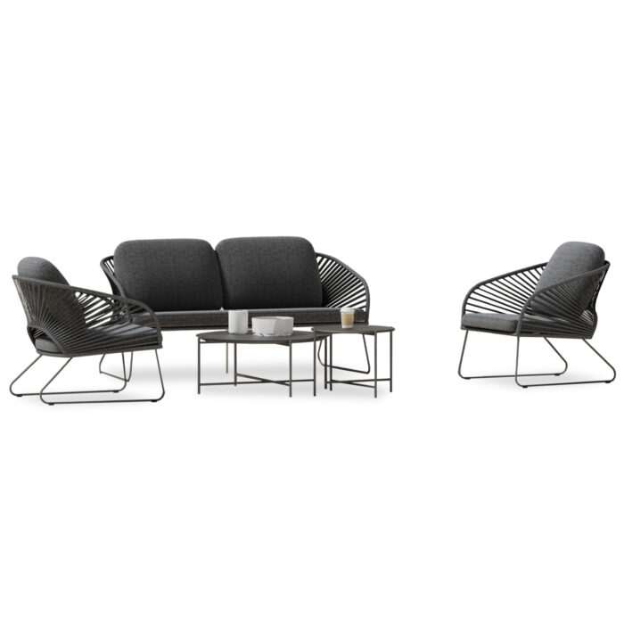 Το σετ αποτελείται από έναν 2-θέσιο καναπέ, δύο αναπαυτικές πολυθρόνες και δύο στρογγυλά τραπεζάκια διαφορετικών μεγεθών — δημιουργώντας μια αρμονική και λειτουργική σύνθεση για στιγμές χαλάρωσης και φιλοξενίας.