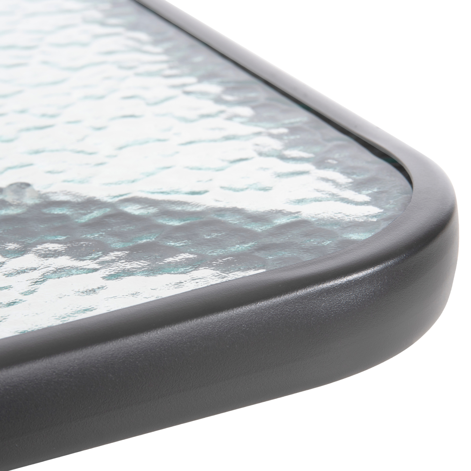 Ένα τραπέζι μεταλλικό εξωτερικού χώρου σε χρώμα γκρι-ανθρακί, με ενσωματωμένο τζαμί ασφάλειας (secure).