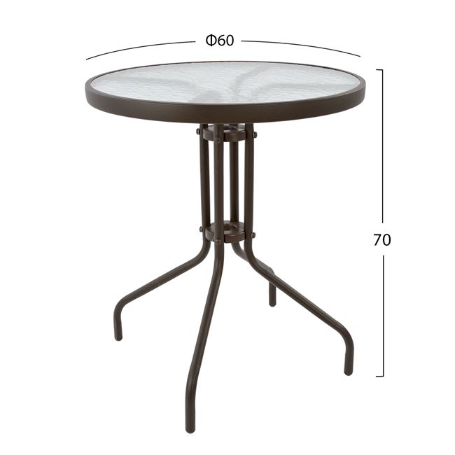 Ένα τραπέζι μεταλλικό εξωτερικού χώρου σε χρώμα καφέ, με ενσωματωμένο τζαμί ασφάλειας (secure).