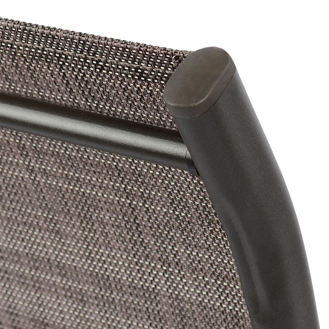Δύο πολυθρόνες εξωτερικού χώρου από μεταλλικό σκελετό σε καφέ χρώμα με textilene 2×1 μεγάλης αντοχής σε ήλιο και βροχή.