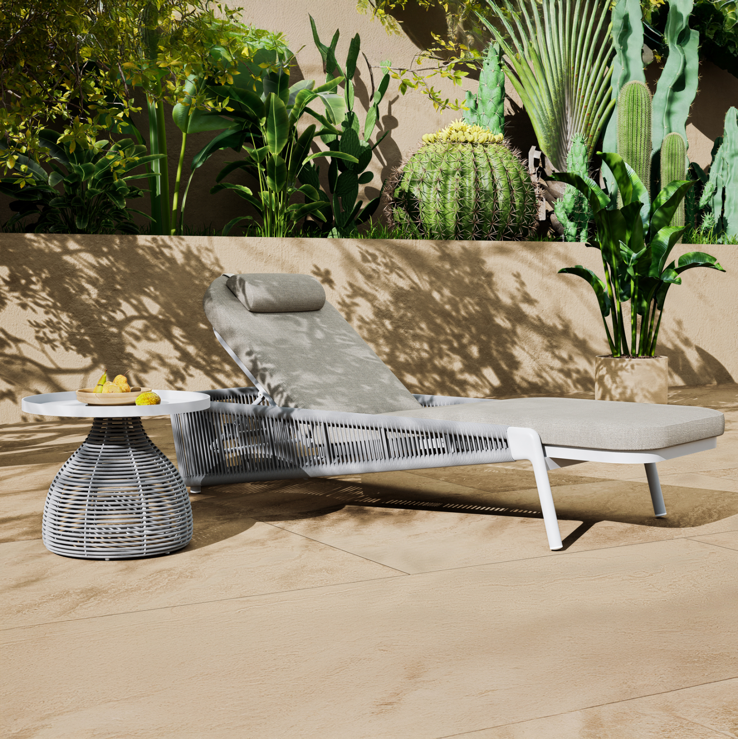 Η ξαπλώστρα XANTION είναι μια κομψή και άνετη επιλογή για τον εξωτερικό σας χώρο. Ο εκπληκτικός σχεδιασμός της με τις όμορφες καμπύλες και τις ανοιχτές αποχρώσεις συνδυάζει την αισθητική με τη λειτουργικότητα, προσφέροντας ιδανικό σημείο χαλάρωσης. Διαθέτει ανθεκτικό σκελετό από αλουμίνιο σε IVORY χρώμα και επένδυση από σχοινί πάχους 6mm σε ΜΠΕΖ, προσδίδοντας στυλ και σταθερότητα. Τα μαξιλάρια με επένδυση από ύφασμα OLEFIN 360g/m2 εξασφαλίζουν υψηλή αντοχή στις καιρικές συνθήκες και άνεση σε κάθε χρήση. Το εξτρά μαξιλαράκι κεφαλής ολοκληρώνει ιδανικά την εικόνα αυτής της μοναδικής ξαπλώστρας.