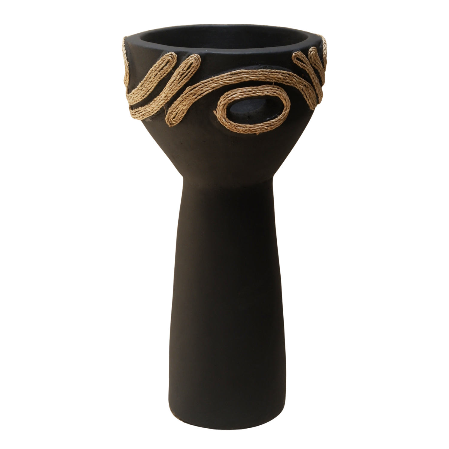 Το DEAN είναι ένα εντυπωσιακό διακοσμητικό βάζο σε σχήμα ψηλού κυπέλλου που προσθέτει χαρακτήρα και ένταση σε κάθε χώρο. Η μαύρη τερακότα δημιουργεί μια δυναμική, γήινη παρουσία, ενώ η διακόσμηση με σχοινί agel πλευρικά προσφέρει φυσική υφή και αυθεντικό, χειροποίητο ύφος. Ιδανικό για κονσόλες, τραπέζια ή επαγγελματικούς χώρους που αναζητούν ιδιαίτερες λεπτομέρειες με premium αισθητική.