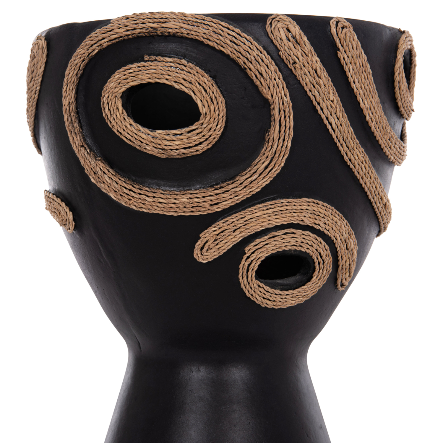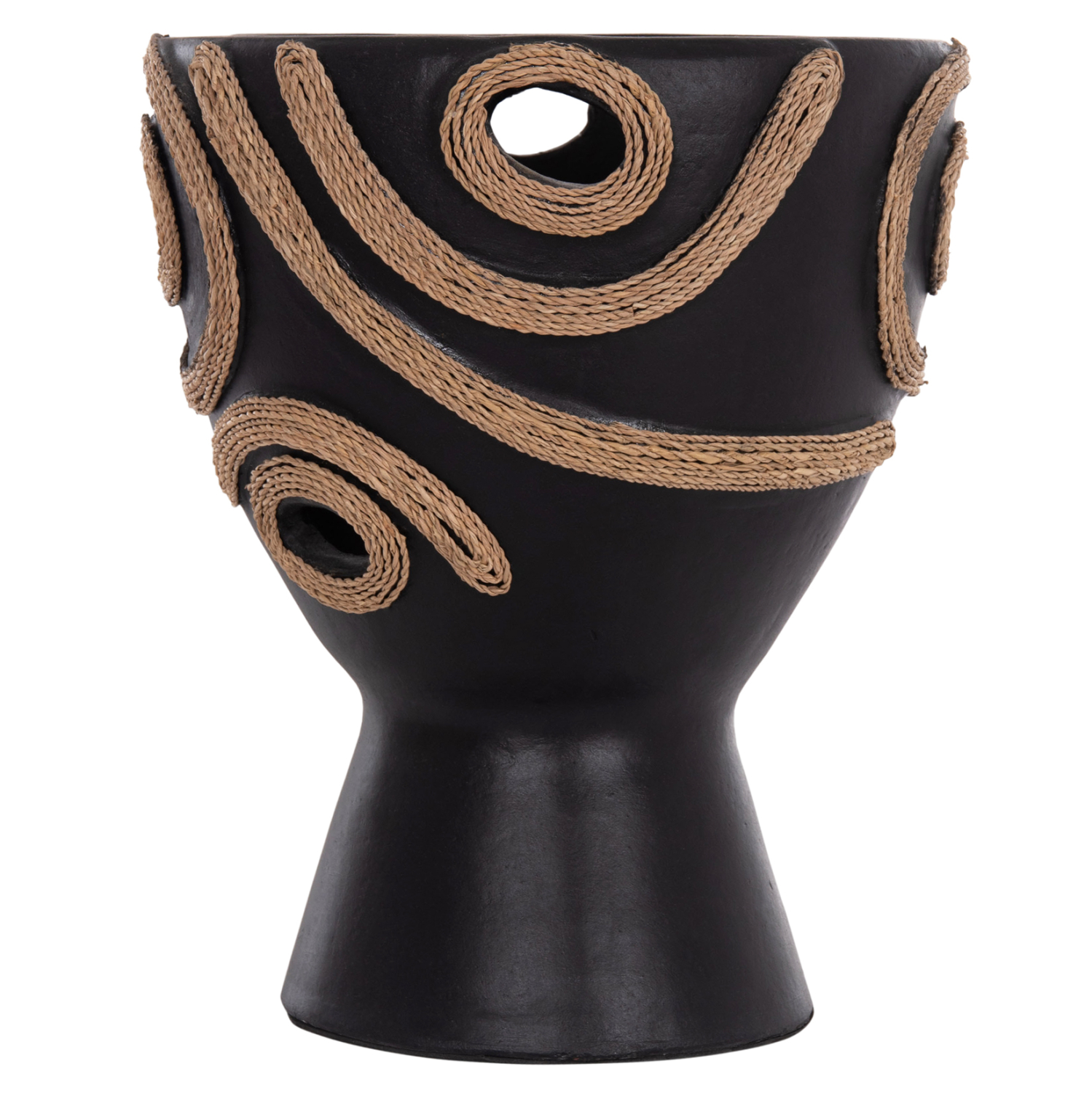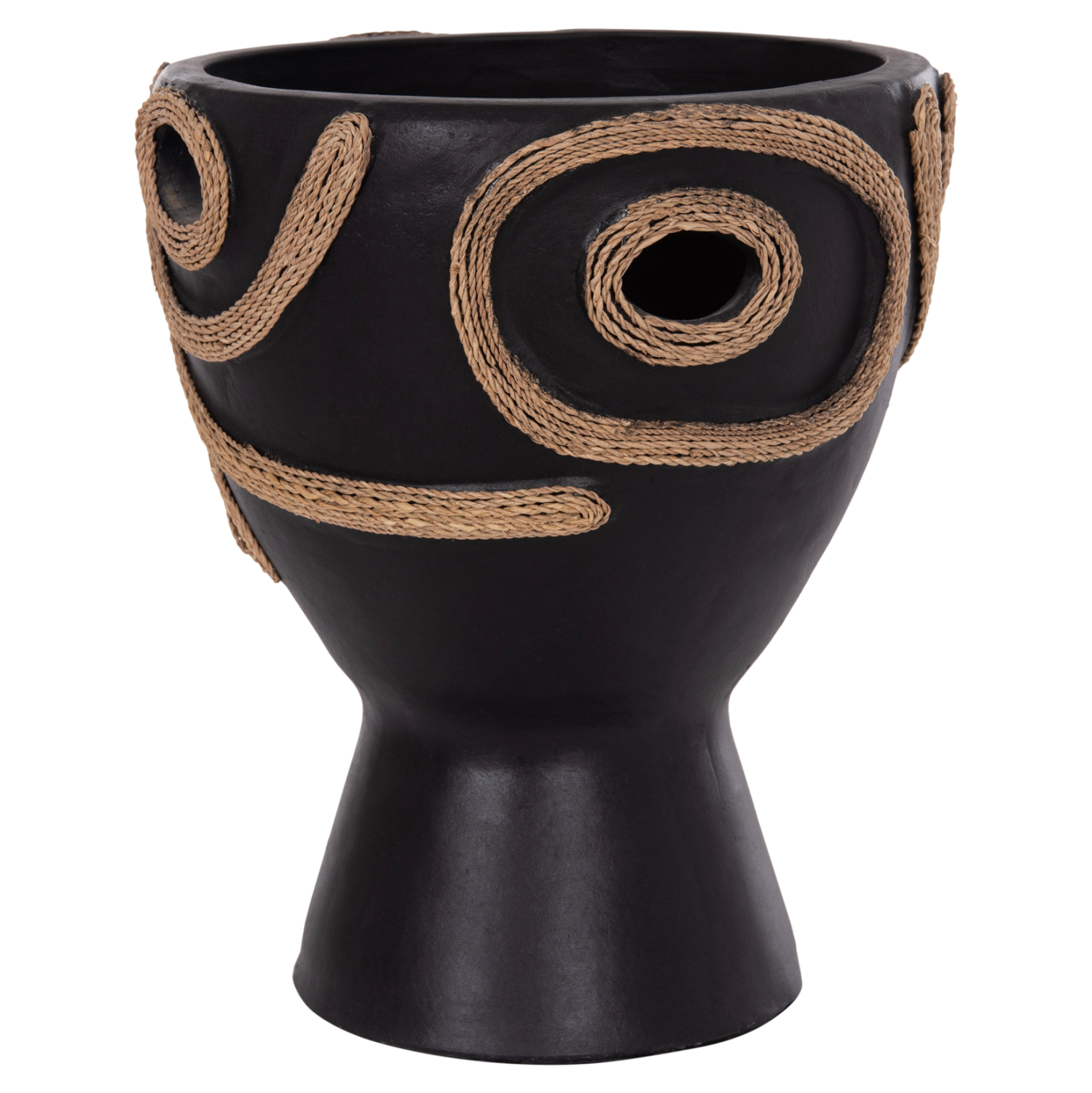 Το επιτραπέζιο χειροποίητο διακοσμητικό βάζο DEAN έχει το σχήμα μεγάλου κύπελλου. Είναι κατασκευασμένο εξολοκλήρου από τερακότα σε ΜΑΥΡΟ χρώμα ενώ διαθέτει διακοσμητικά σχέδια με σχοινί από ίνες φοίνικα κολλημένο στις πλευρές του βάζου. Ιδανικό για πληθώρα χώρων, τόσο για το σπίτι, όσο και για επαγγελματικούς χώρους.