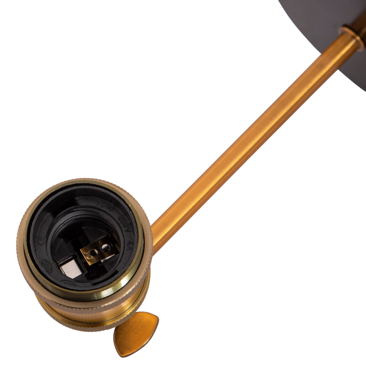 Η απλίκα τοίχου RESTON είναι μια λιτή πρόταση σε industrial στυλ, με ΜΑΥΡΗ μεταλλική βάση, και ΧΡΥΣΟ βραχίονα, με επίσης ΧΡΥΣΟ ντουί από αλουμίνιο. Ο βραχίονας είναι ρυθμιζόμενος με περιστροφική «πεταλούδα» (βίδα).