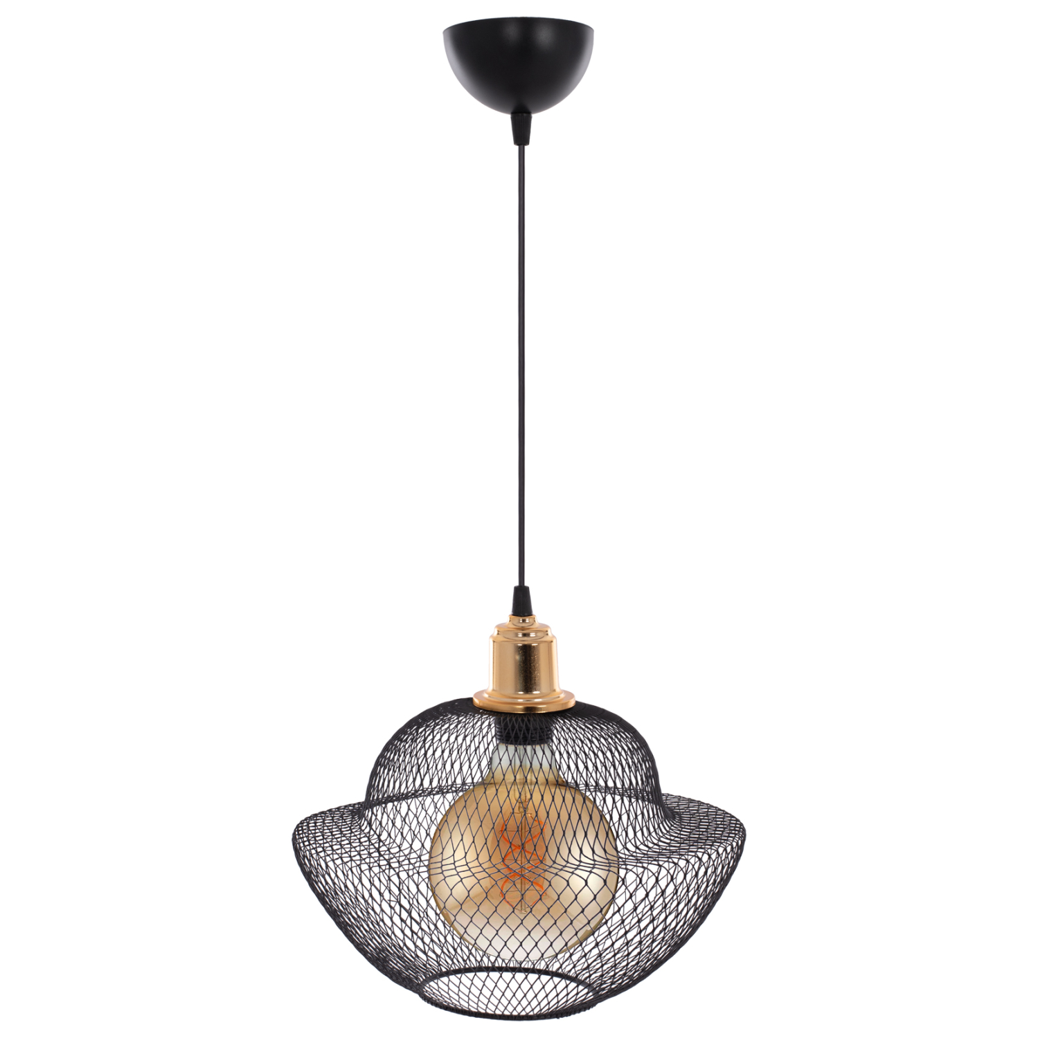 Hm7690.01-κρεμαστό —-Αφήστε το φως να απλωθεί στον χώρο με ένα πρωτότυπο και φινετσάτο μονόφωτο οροφής, ολοκληρώνοντας την διακόσμησή σας. Το «καπέλο» του φωτιστικού αποτελείται από ένα πυκνό μεταλλικό πλέγμα σε μοντέρνο και ιδιαίτερο σχήμα και είναι η επιτομή του μοντέρνου design. Η διαφορετική «πινελιά» αυτού του κρεμαστού μονόφωτου είναι το χρυσό ντουί του λαμπτήρα το οποίο είναι λουστραρισμένο δίνοντας μια αίσθηση πολυτέλειας.