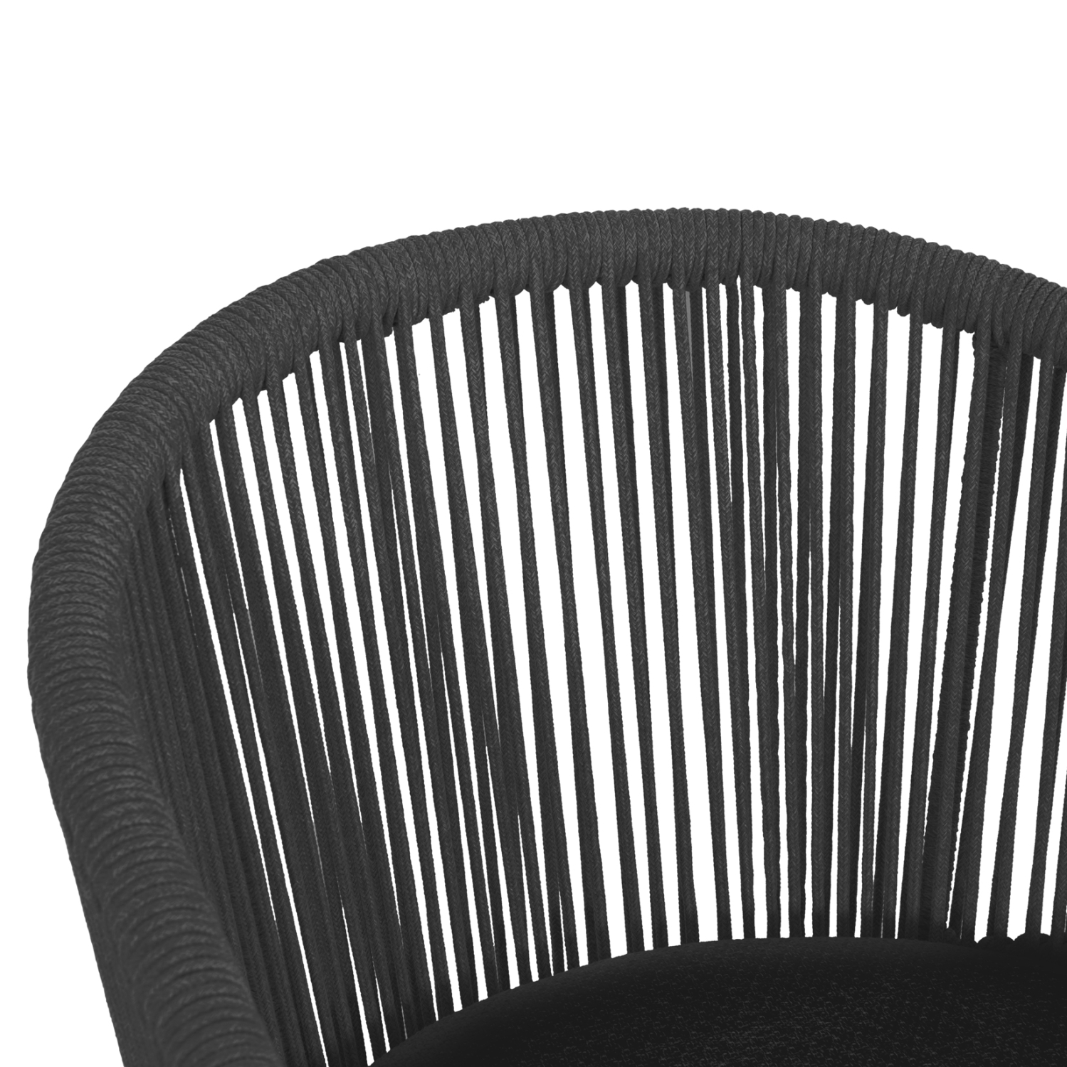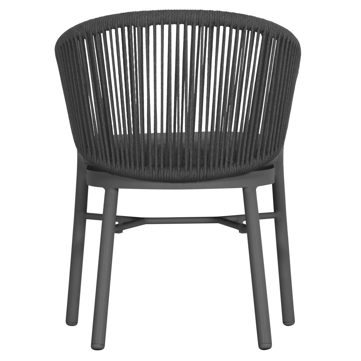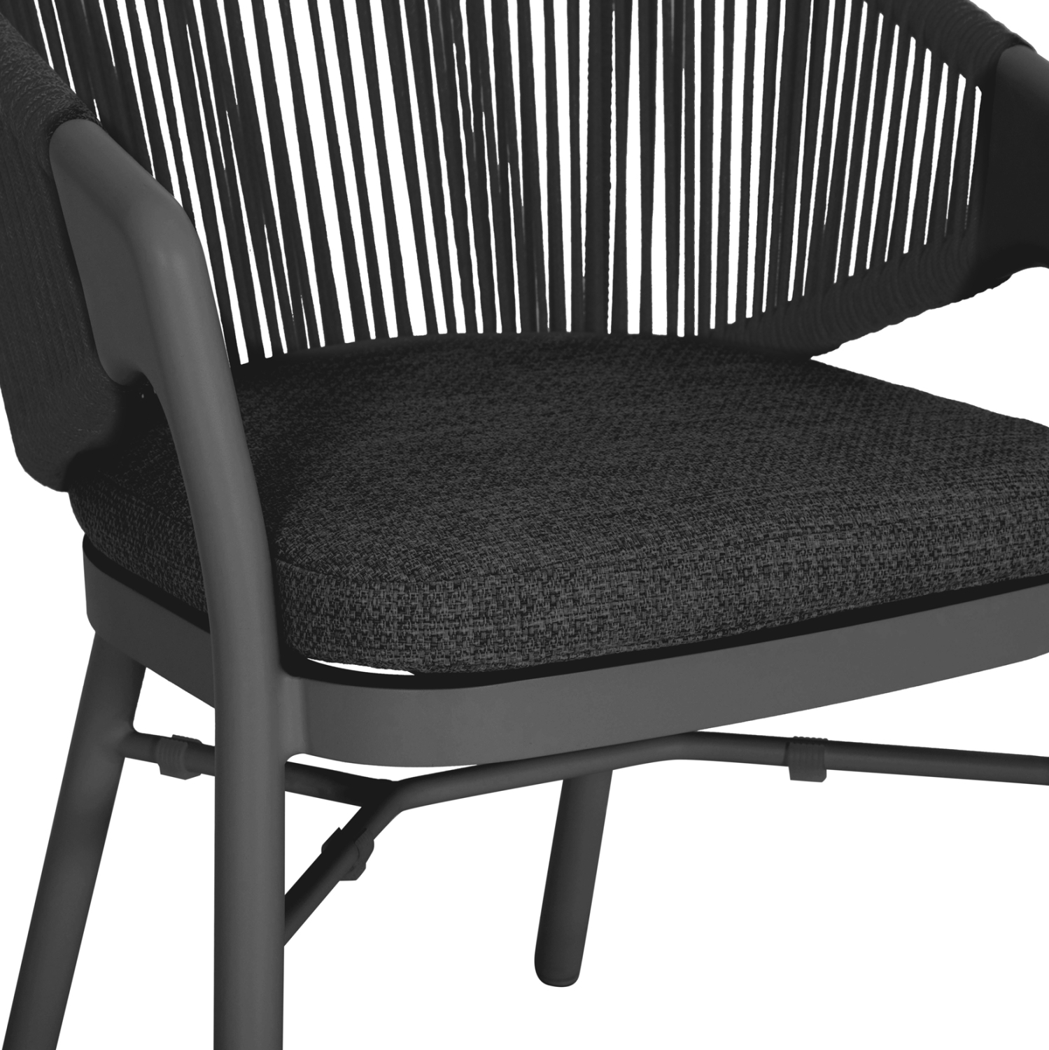 Η πολυθρόνα τραπεζαρίας εξωτερικού χώρου XANTION συνδυάζει άψογα την κομψότητα με τη λειτουργικότητα, αποτελώντας ιδανική επιλογή για βεράντες, αυλές και επαγγελματικούς χώρους φιλοξενίας. Διαθέτει ημικυκλική πλάτη με εντυπωσιακή πλέξη σχοινιού 6mm σε σκούρο γκρι χρώμα, που αγκαλιάζει το σώμα και προσφέρει αναπαυτική στήριξη. Ο σκελετός είναι από αλουμίνιο σε απόχρωση ΣΚΟΥΡΟ ΓΚΡΙ, προσδίδοντας μοντέρνο χαρακτήρα και υψηλή αντοχή στις εξωτερικές συνθήκες. Το μαξιλάρι καθίσματος διαθέτει αφαιρούμενο κάλυμμα από ύφασμα OLEFIN, εξαιρετικά ανθεκτικό στο νερό και στην ηλιακή ακτινοβολία.