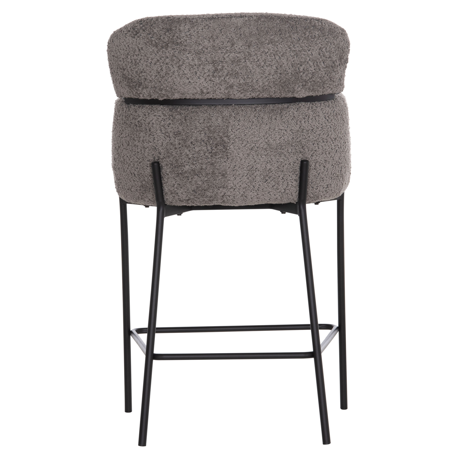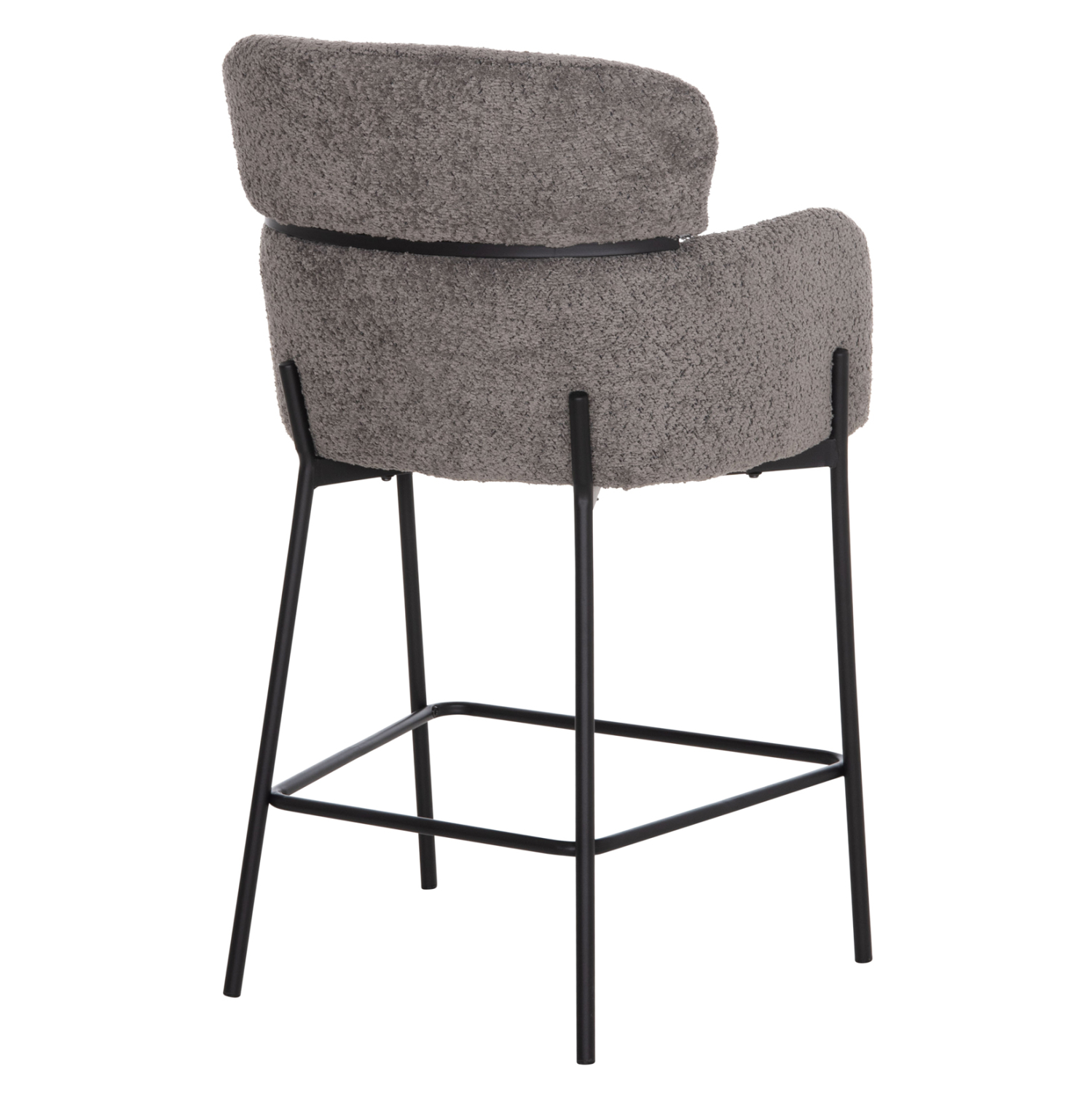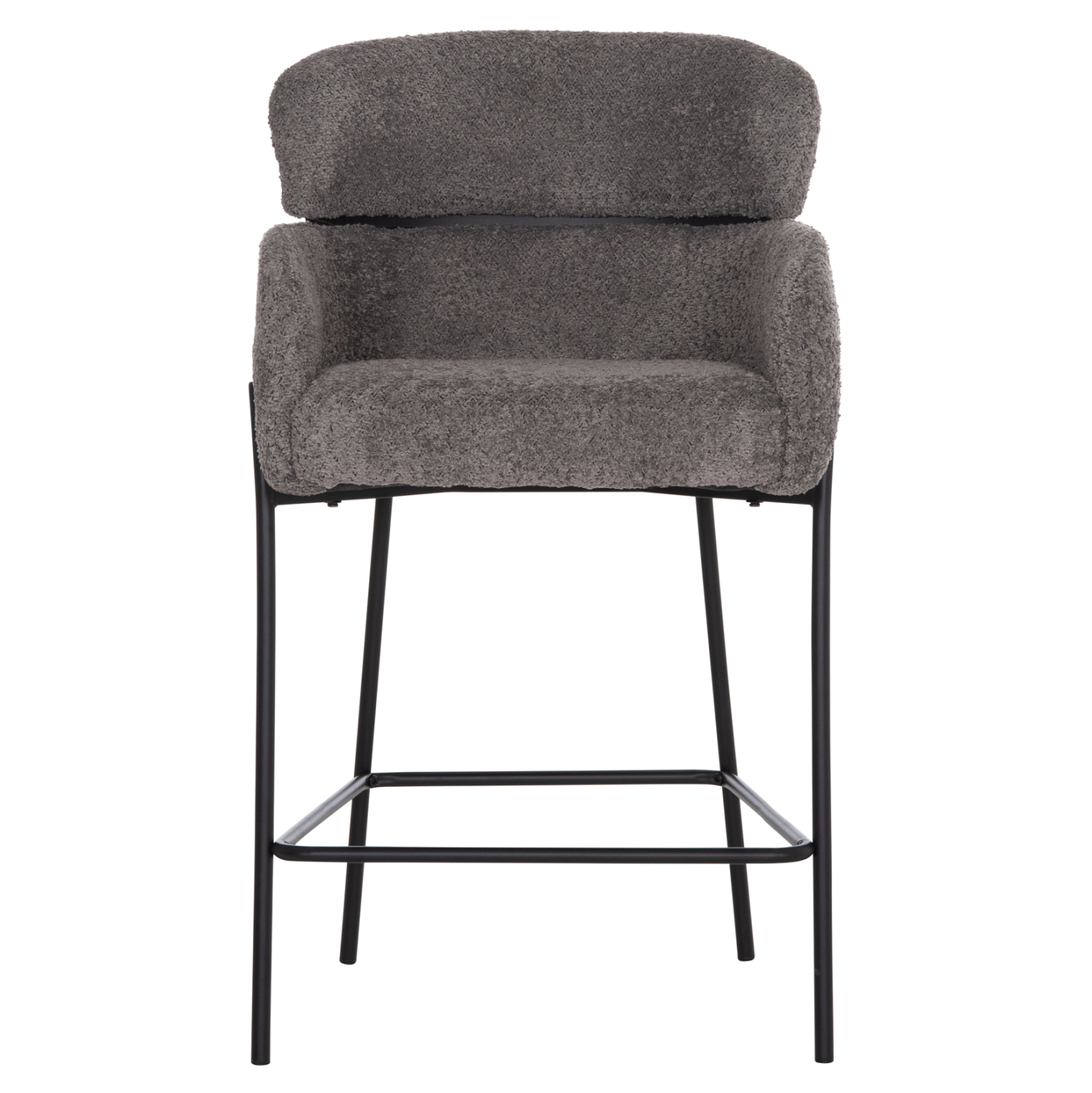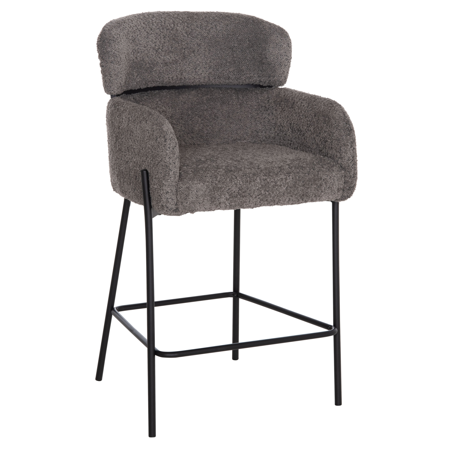 Επαγγελματικό σκαμπό bar WOLF σε ΓΚΡΙ χρώμα με ΜΑΥΡΑ μεταλλικά πόδια. Τα πόδια ενώνονται μεταξύ τους περίπου στη μέση τους με μια μεταλλική ράγα. Το σκαμπό είναι λιτό, ποιοτικό και κομψό στην όψη, και σίγουρα τραβάει τα βλέμματα με το ύφασμα μπουκλέ που είναι επενδυμένο. Είναι μεσαίου ύψους με πλάτη η οποία αγκαλιάζει το σώμα ενώ διαθέτει σχετικά ψηλά μπράτσα, πράγμα που επιτείνει τον αναπαυτικό χαρακτήρα αυτού του σκαμπό.