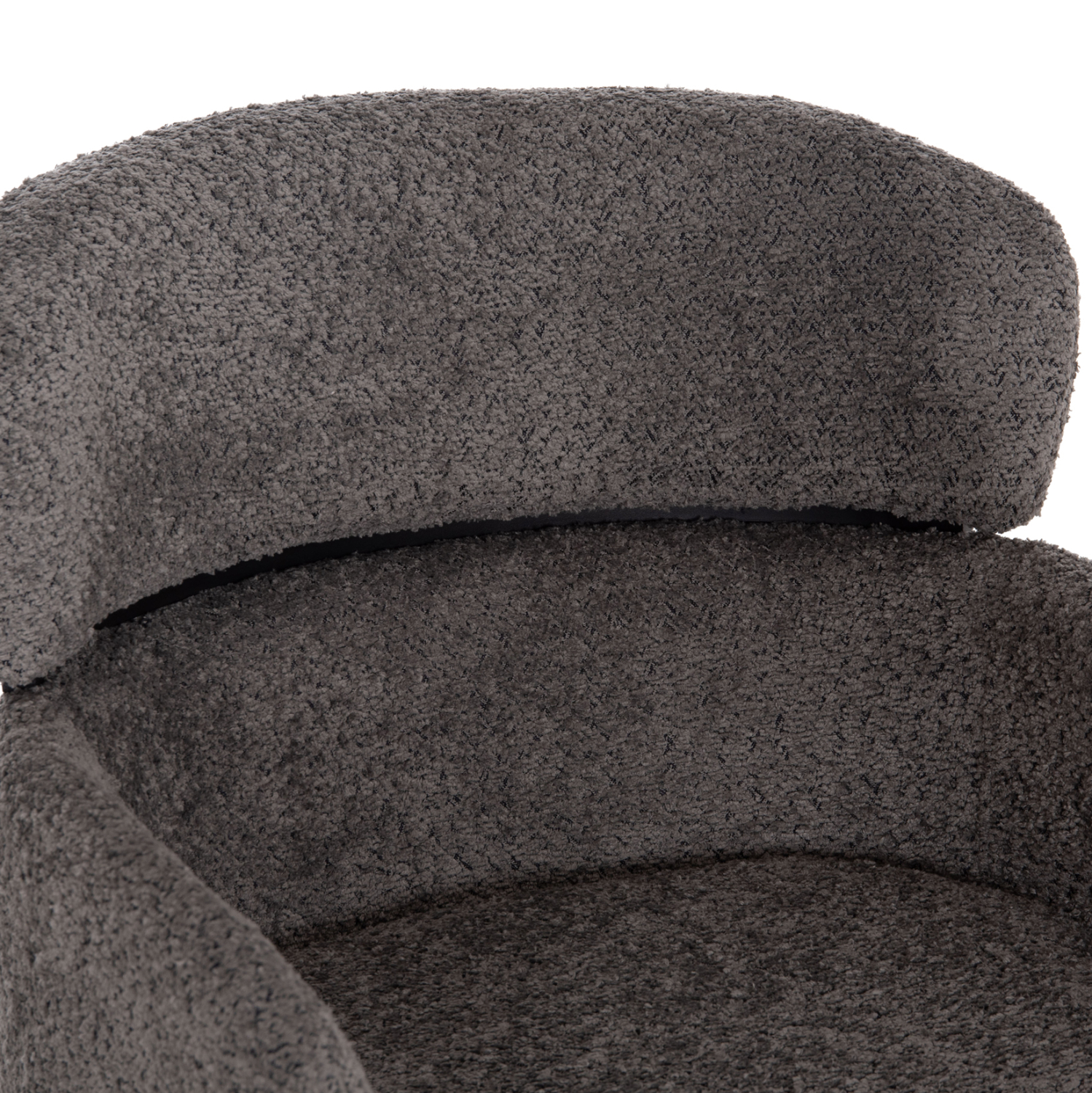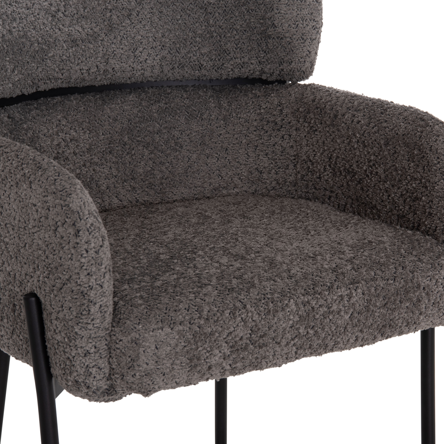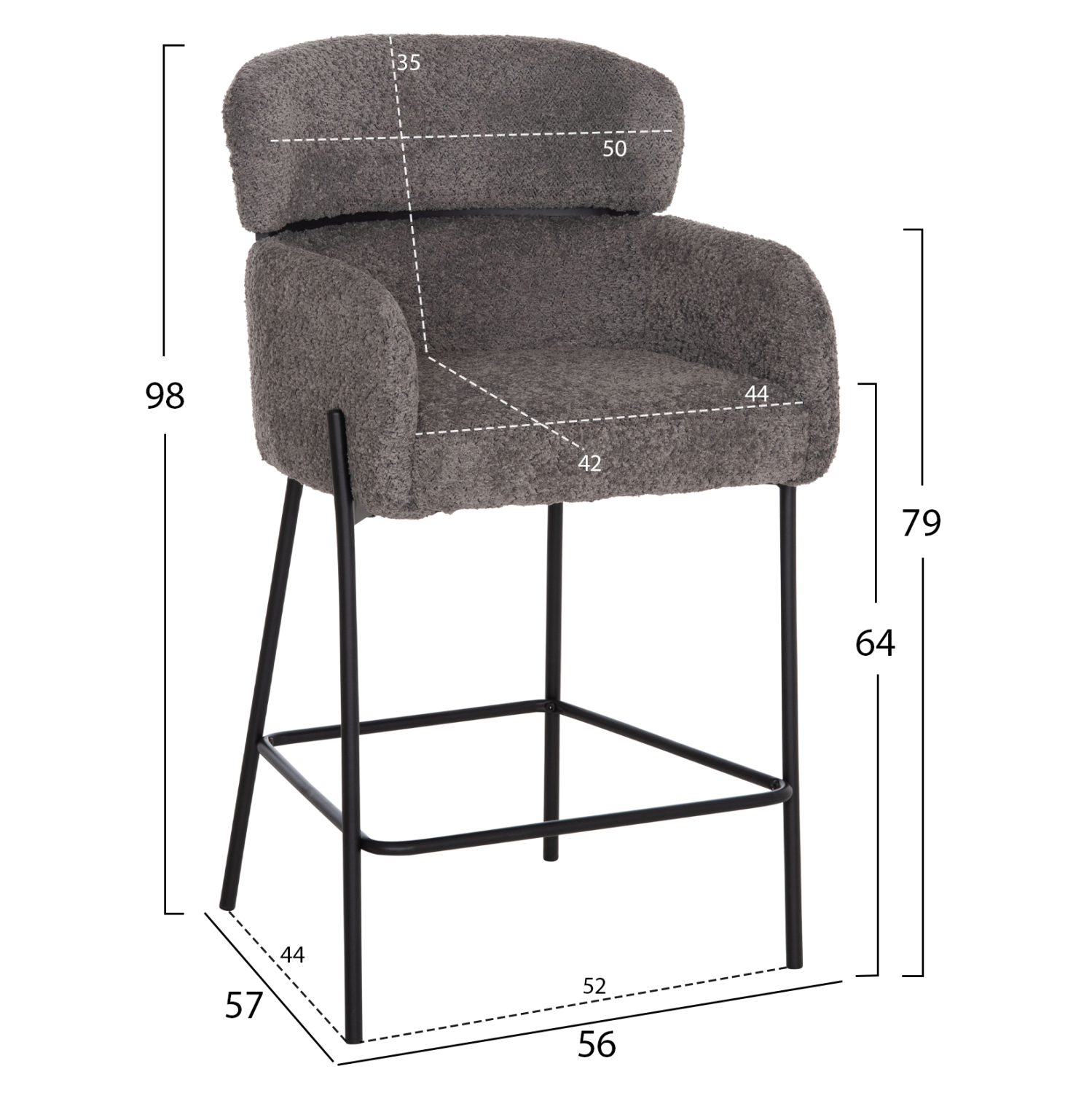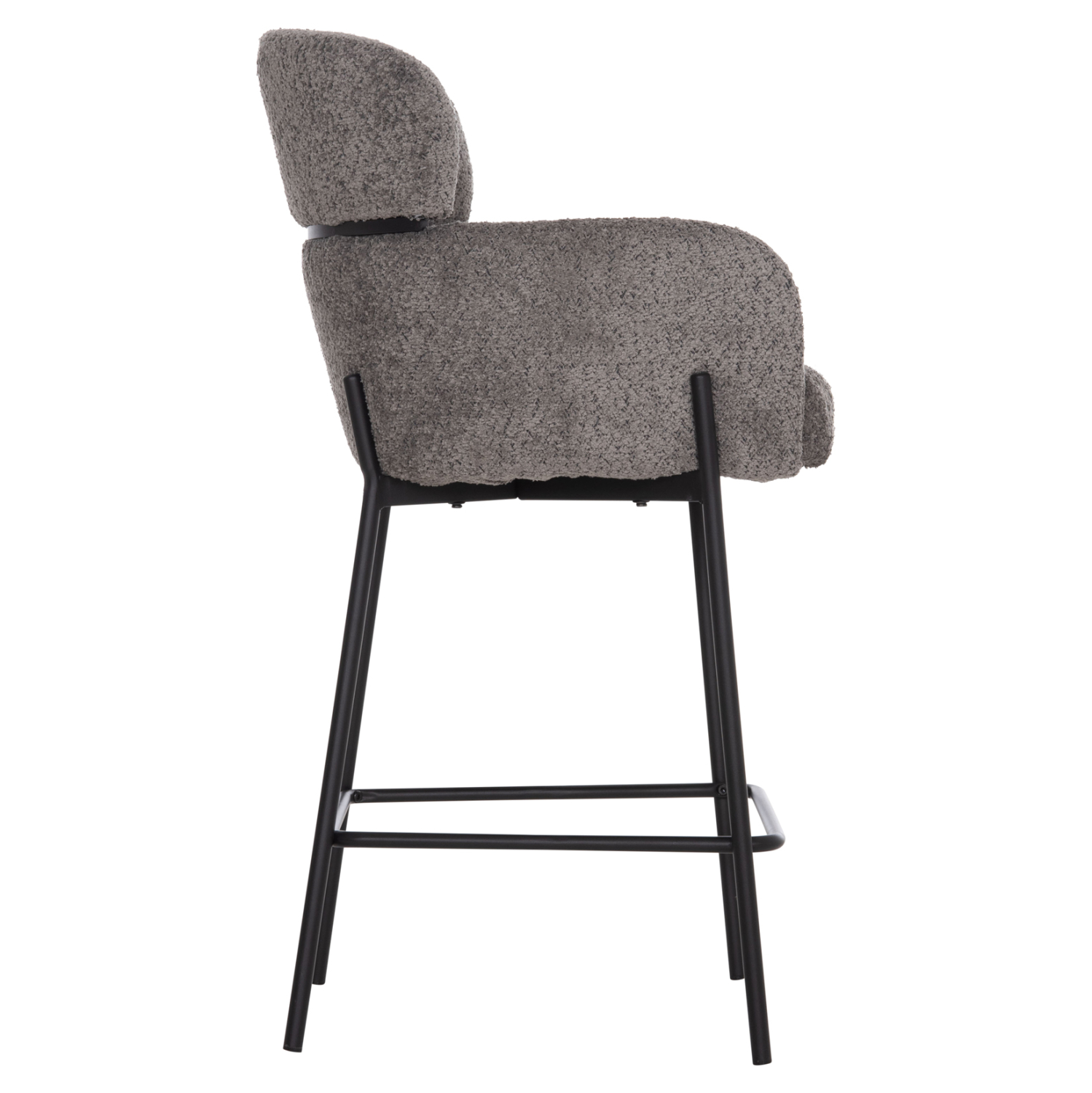 Επαγγελματικό σκαμπό bar WOLF σε ΓΚΡΙ χρώμα με ΜΑΥΡΑ μεταλλικά πόδια. Τα πόδια ενώνονται μεταξύ τους περίπου στη μέση τους με μια μεταλλική ράγα. Το σκαμπό είναι λιτό, ποιοτικό και κομψό στην όψη, και σίγουρα τραβάει τα βλέμματα με το ύφασμα μπουκλέ που είναι επενδυμένο. Είναι μεσαίου ύψους με πλάτη η οποία αγκαλιάζει το σώμα ενώ διαθέτει σχετικά ψηλά μπράτσα, πράγμα που επιτείνει τον αναπαυτικό χαρακτήρα αυτού του σκαμπό.